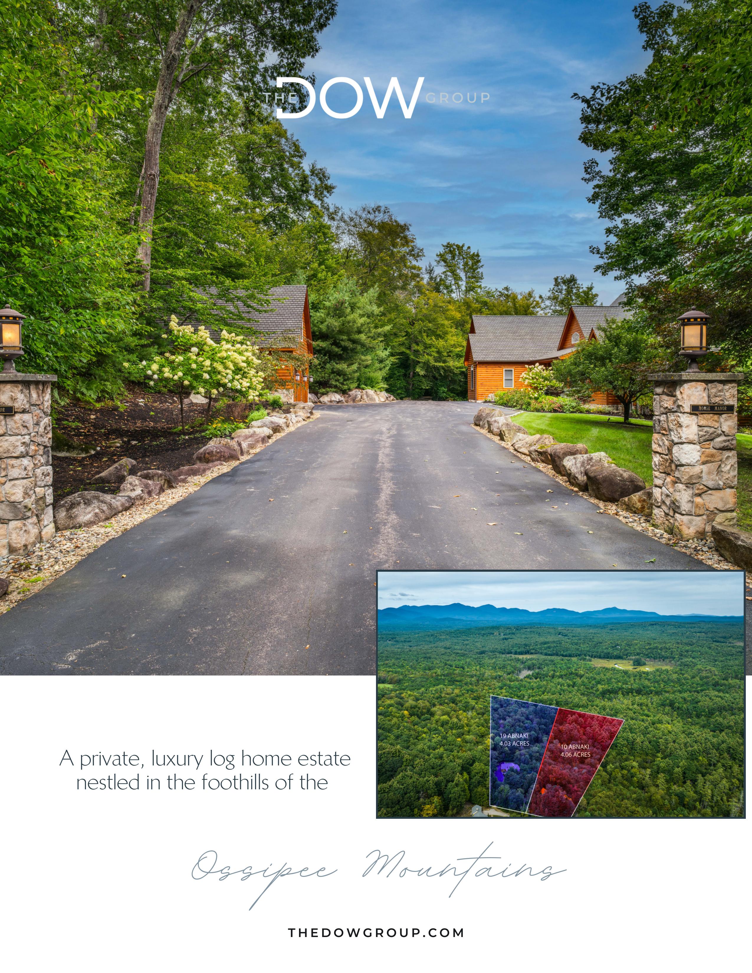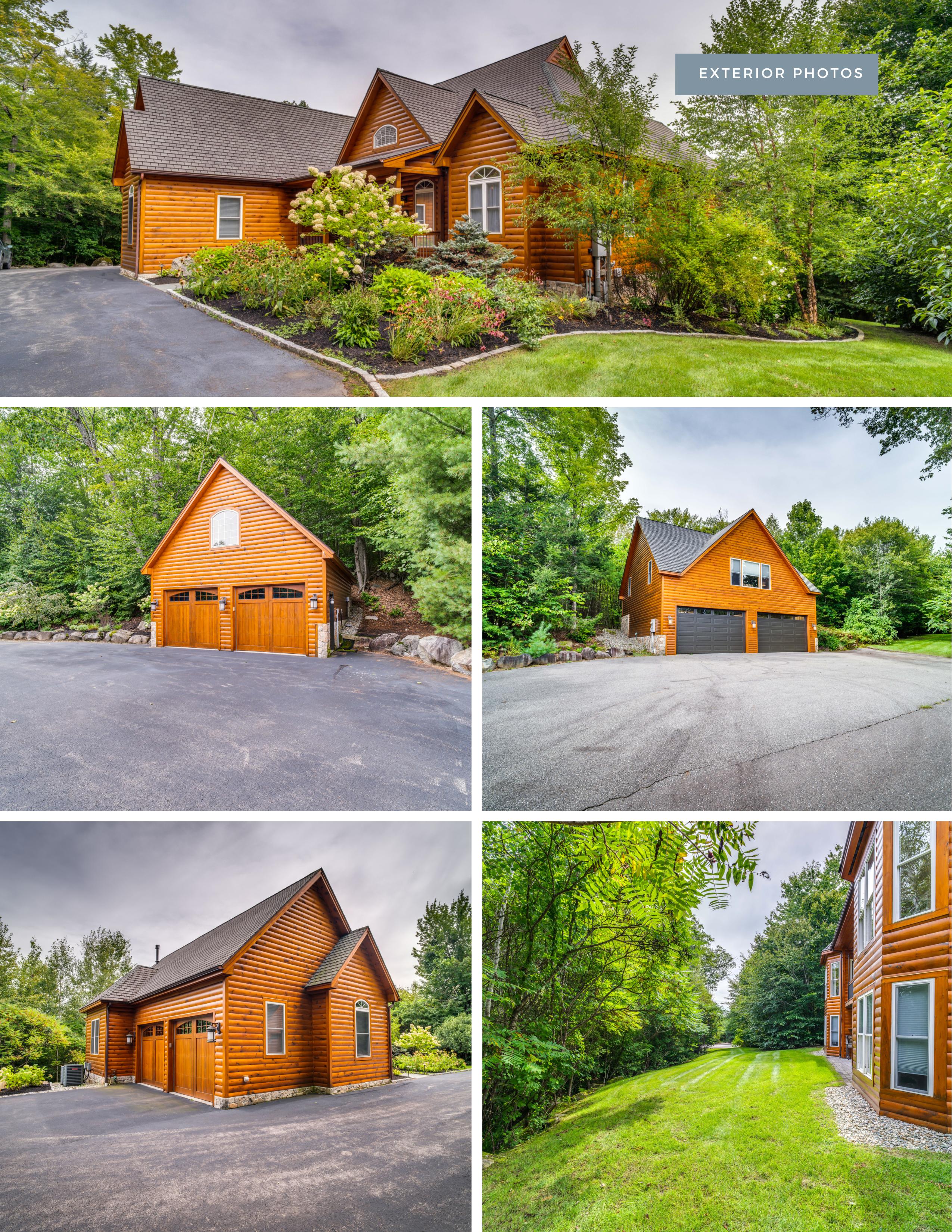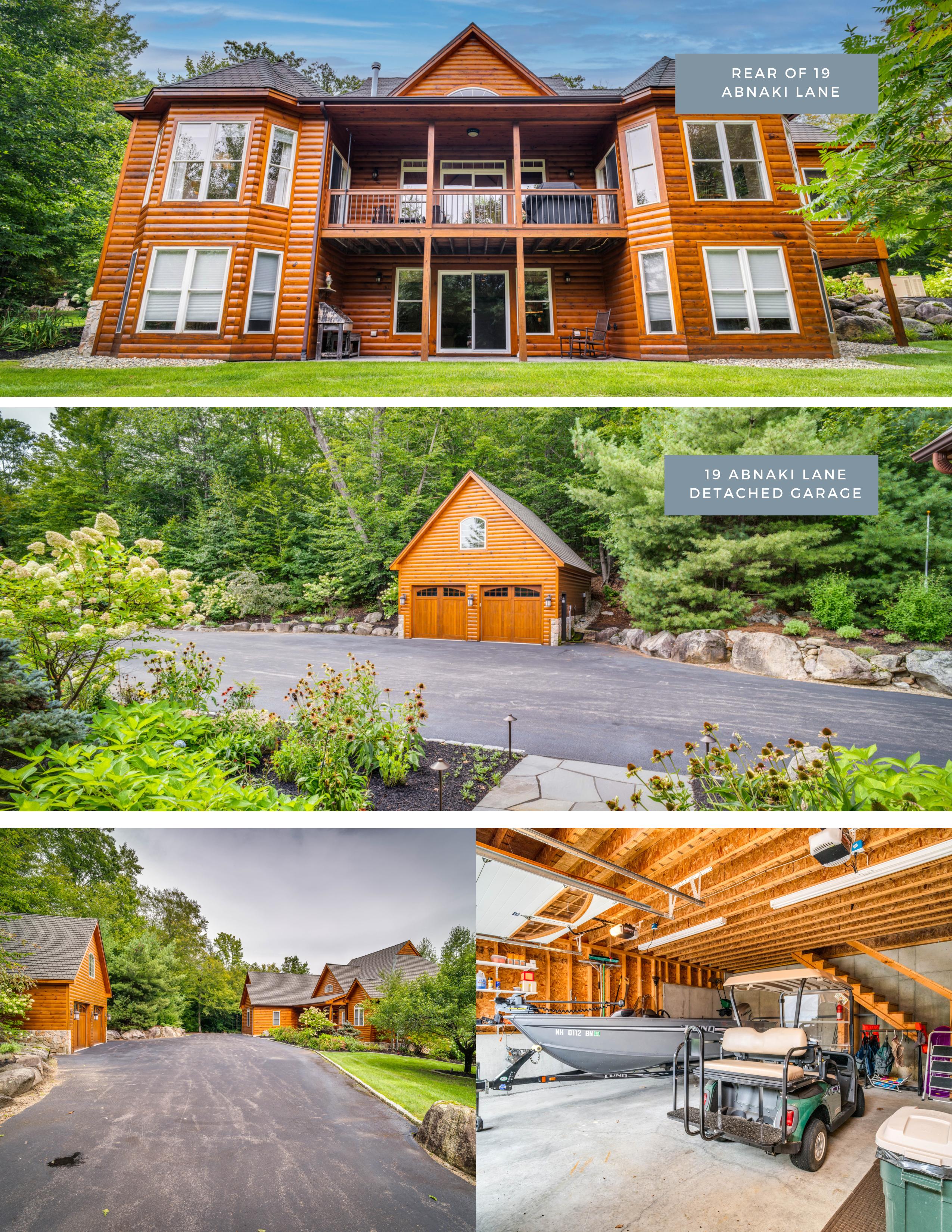 Welcome to Moose Manor. A private luxury log home estate, located in low-tax Moultonborough, nestled in the foothills of the Ossipee Mountains, on over 8 acres of land. The property consists of two separate lots, each with just over 4 acres of land. Three separate buildings: 19 Abnaki Lane, the main log home is a raised ranch for easy first-floor living. Open concept kitchen complete with Viking appliances, three-season porch, office, full walkout lower level with additional living room and two more ensuites. Next is a detached garage with bonus space ready to be finished above. 10 Abnaki lane, a guest house with an additional 2 bedrooms, sits above an oversized garage with 2 - 16' garage bays. The property is both professionally staged and furnished by Home Comfort and professionally landscaped.