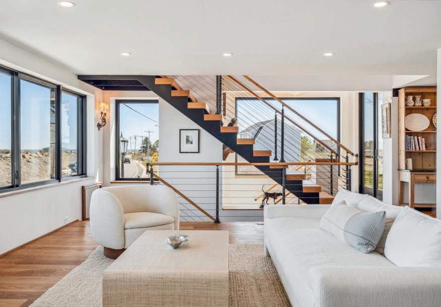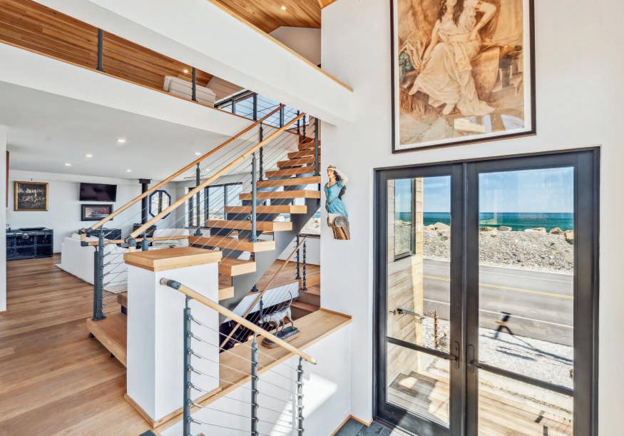 Step into a sustainably built home that blends modern elegance with coastal charm. The foyer features a dazzling crystal chandelier from NYC’s Tepper Gallery, soaring Marvin glass doors, and a Scandinavian-inspired waterfall staircase with custom cable railing. Expansive picture windows frame stunning ocean views from the moment you arrive.