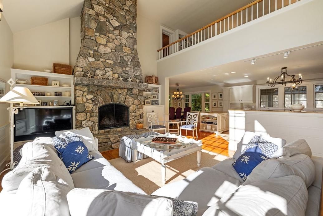 Open to Living room with floor to ceiling fireplace