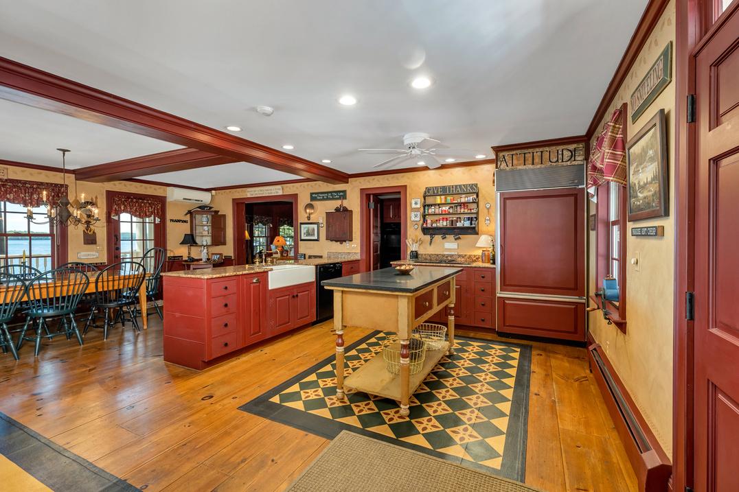 and surround sound The exterior landscape features extensive stone work, including native NH fieldstone pillars at the entrance to the property and stonewalls on the sidelines of the property. There are many outdoor areas to enjoy lake living - lakeside patios, covered porches and a patio off the kitchen with a grilling area on the Eastern side of the property, providing a cooler spot to enjoy on those hot summer days The home itself is Impeccably maintained and offers over 6,000 square feet of finished living space that includes 6 bedrooms and 6 baths, (the home has a 4 bedroom septic system). There is a very nicely appointed kitchen with fireplace, sitting area and dining area that is highlighted by an antique French table with seating for up to 18 There is a huge, walk-in pantry directly off the kitchen for all of the oversized items, extra groceries, etc The sprawling great room has soaring ceilings and a beautiful gas fireplace that accommodates large gatherings with ease. The very private master suite is located on its own end of the house with private decks, sitting room, walk-in closet, full bath with custom, walk-in shower, soaking tub, and double sinks The tavern room features a custom-made chestnut bar that includes a wet bar and refrigerator that overlooks the lake. The finished walkout lower level is built for fun and is a full daylight and walkout lower level with beautiful lake views and direct access to the water. Rooms in the lower level include the family room with wet bar and billiards area, 2 bedrooms, 2 additional rooms with beds, 3 baths, laundry room and mechanical areas The property is exceptionally landscaped with a full exterior irrigation system Sound system throughout the main floor that is controllable by room and also extends to the covered porch and at the waterfront. Security system and camera system for peace of mind There are 2 detached garages with parking for 4 vehicles, and ample parking in the paved driveway Whole house, on-demand generator that flips on when the power goes out for uninterrupted service and enjoyment There is a traditional forced hot water heating system that is supported by 2 boilers. There are also 7 mini splits that provide central air conditioning and also heat pumps which are lovely in the shoulder seasons There are 3 gas fireplaces in the home for wonderful ambiance and supplemental heating This property is part of the sought-after Wildwood association, which has paved roads, tennis courts and an exceptionally beautiful, sandy beach.