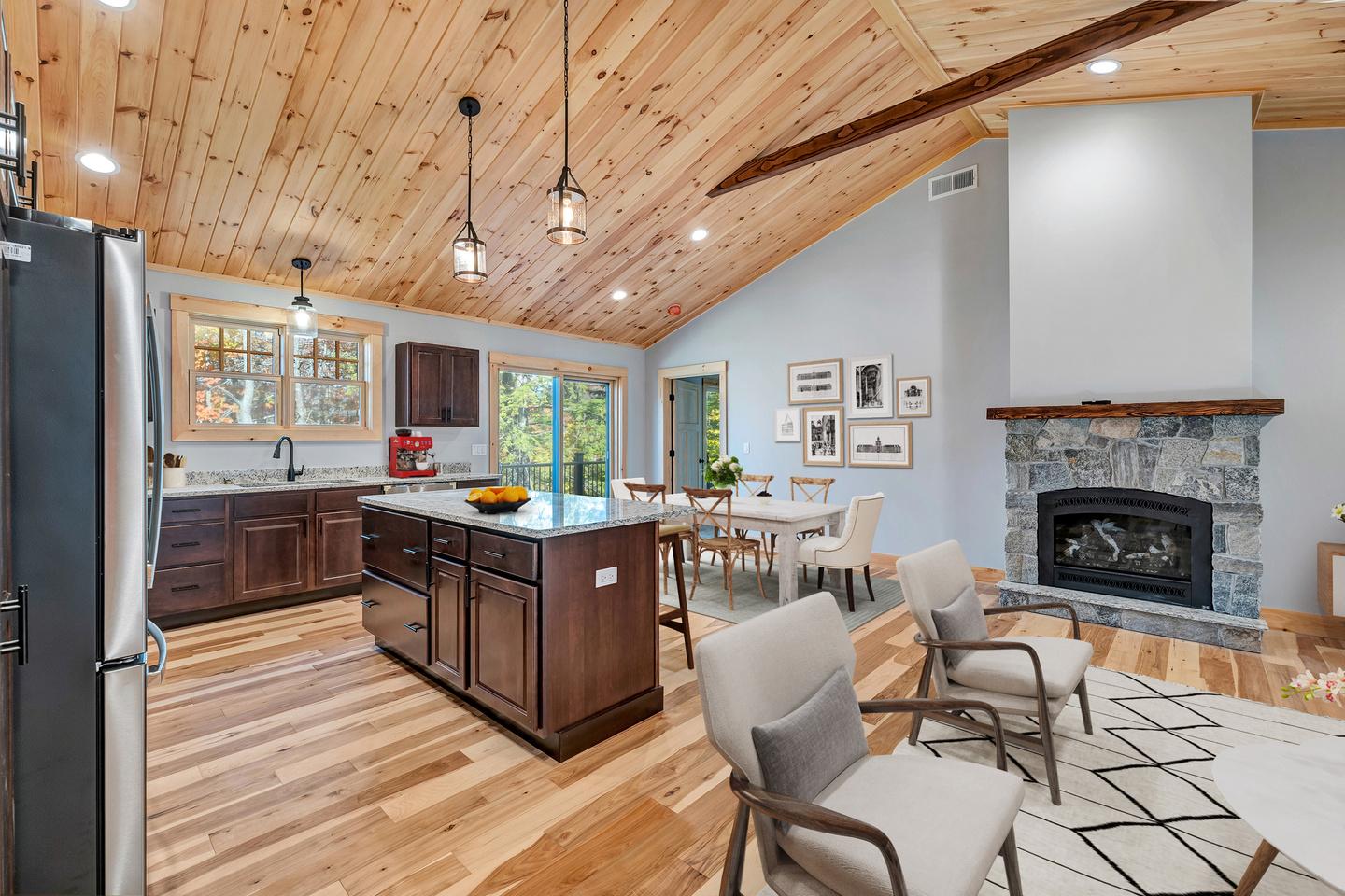 Gilford, NH Brand new luxury 4 bedroom, 3 bathroom home features multiple entertaining rooms so there is space to share. Entering through the front door brings you into the main entertaining space with the kitchen, the dining room and the upper level living area showcasing a Connecticut Fieldstone Gas Fireplace. The main level also holds the primary bedroom and ensuite bath with laundry plus a second bedroom or possible office next to the mudroom or sports equipment room. The main level is completed with the second bathroom easily accessible to entertainment space. The lower level is a walkout with a second living room with additional bedrooms on either side plus the Sauna, bathroom, and laundry The lower level walkout has been wired for a Hot tub on the patio The builder also wired the home for a generator The exterior of the home has low maintenance vinyl siding and multiple rock retaining walls Peekaboo mountain views, beach rights (Gilford beach), and easy access to Gunstock Mountain and the Lakes Region's year round activities rounds out this wonderful new home