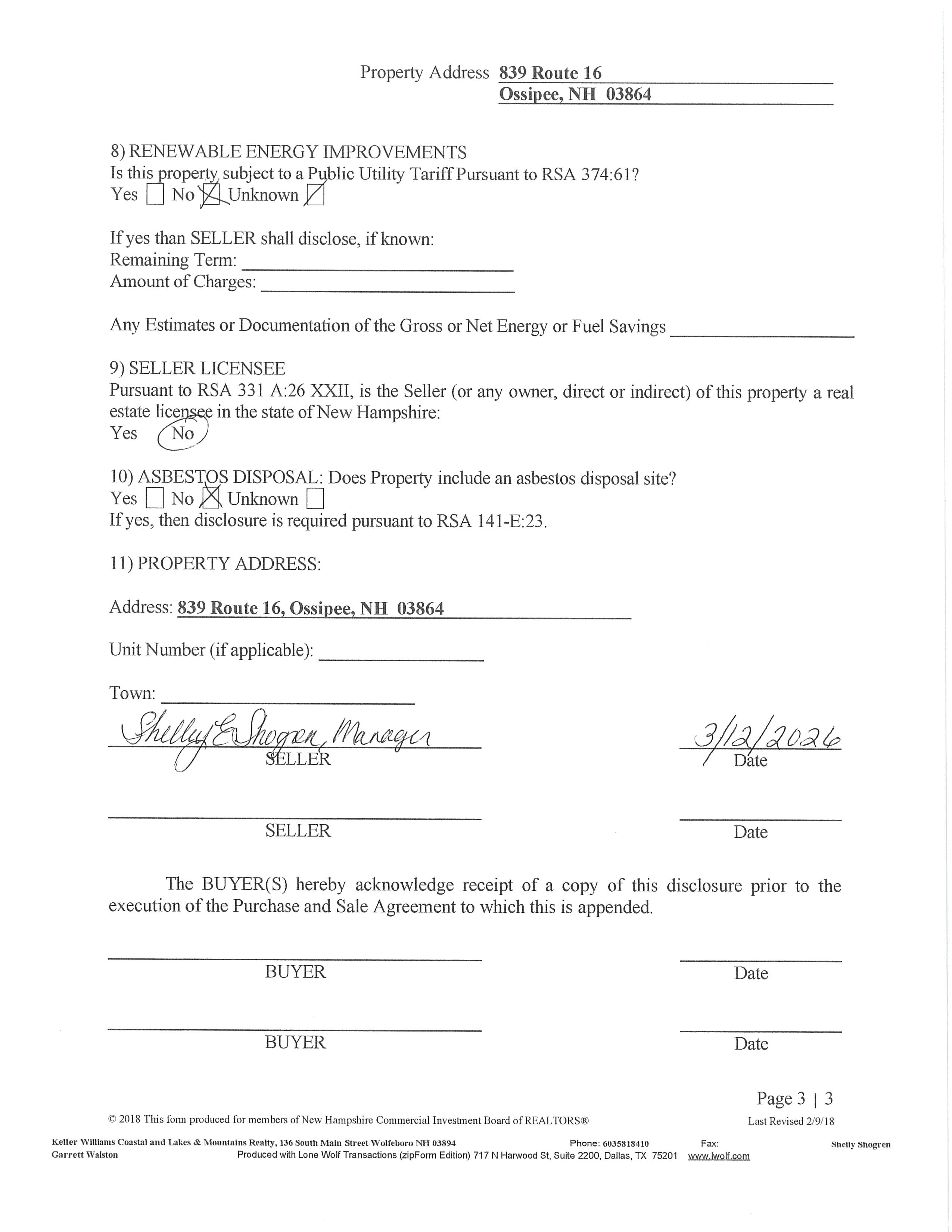 Pursuant to RSA 331 A:26 XXII, is the Seller (or any owner, direct or indirect) of this property a real estate licensee in the state of New Hampshire: Yes No