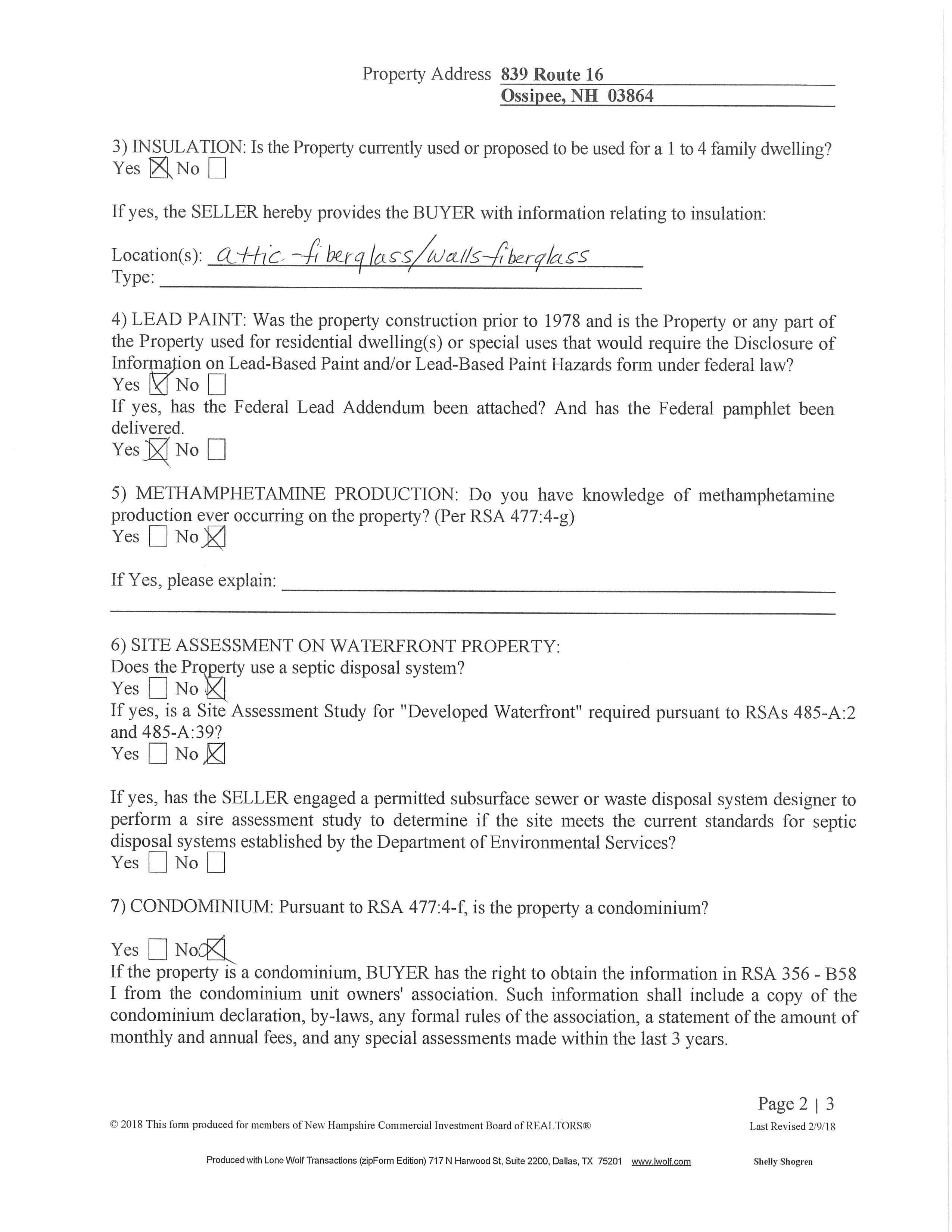 5) METHAMPHETAMINE PRODUCTION: Do you have knowledge of methamphetamine production ever occurring on the property? (Per RSA 477:4-g)
