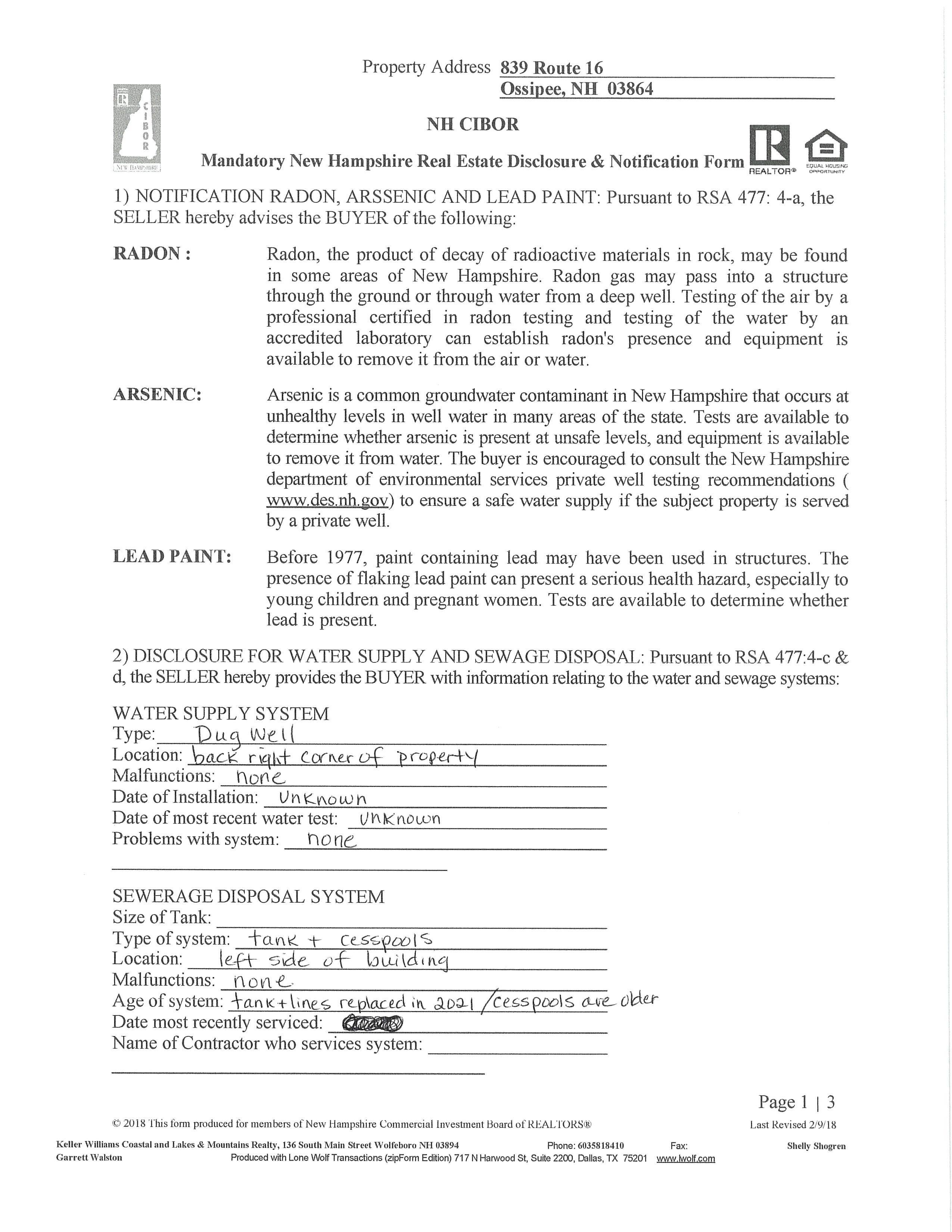 2) DISCLOSURE FOR WATER SUPPLY AND SEWAGE DISPOSAL: Pursuant to RSA 477:4-c & d, the SELLER hereby provides the BUYER with information relating to the water and sewage systems: