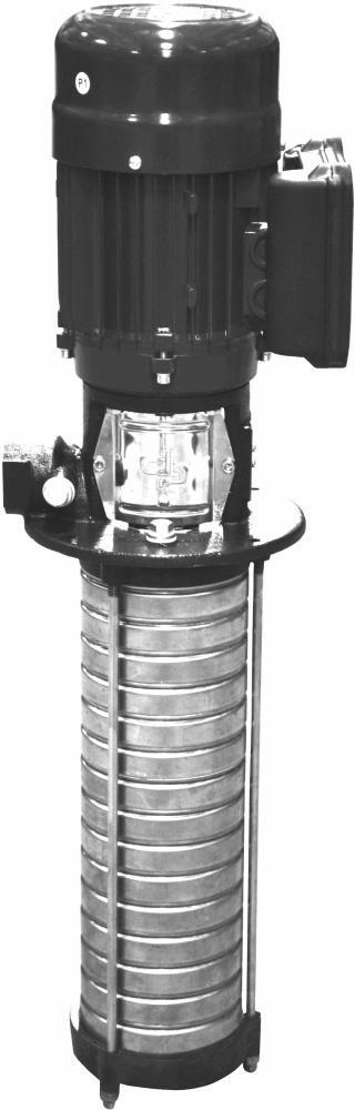 The vertical, single or multi-stage centrifugal immersible pump series is designed for pumping water, filtered cooling fluids or lightly aggressive, watery mediums from a storage tank. The suction side at the bottom of the pump is equipped with a stainless steel strainer. The discharge side is located at the motor stool.