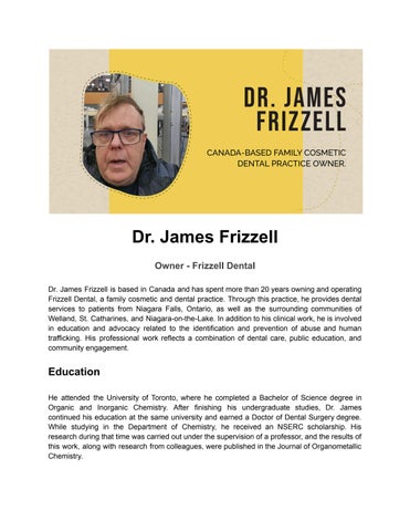 Dr. James Frizzell is based in Canada and has owned and operated Frizzell Dental for more than 20 years. His family's cosmetic dental practice serves patients in Niagara Falls, Ontario, as well as Welland, St. Catharines, and Niagara-on-the-Lake. Along with providing dental care, he is also active in advocacy and education related to abuse awareness and human trafficking. He attended the University of Toronto, where he earned a BSc in Organic/Inorganic Chemistry and later completed his Doctor of Dental Surgery degree. During his studies, he received an NSERC scholarship in the Department of Chemistry and conducted research under the supervision of a professor. The research from that period, along with work by colleagues, was published in the Journal of Organometallic Chemistry. In 1997, he studied at a college in Ajax, Ontario, and earned a Master’s degree in Biblical Studies. In 2019, Dr. Frizzell earned a degree in Dental Forensics from a university in Montreal. Over the years, he has also completed many courses covering areas such as mental health and suicide skill training, digital crime scene photography, civil litigation workshops, and strangulation prevention. At his dental practice, Dr. James and his team provide dental hygiene, restorative dentistry, cosmetic teeth whitening, emergency dental services, and preventive dental care. Preventive services include periodontal therapy, sealants, tooth extraction, routine periodontal care, fluoride applications, and related treatments. Cosmetic solutions offered include a Zoom in-office whitening system, bonding, tooth-colored fillings, porcelain crowns, inlays and onlays, and dental implants. Many patient reviews highlight the practice's supportive care and service. He also served for eight years as a Military Dental Officer with the Canadian Forces Dental Corps. During that time, Dr. James Frizzell helped ensure soldiers were dentally fit during the Gulf Wars and was recognized by the Base Commander at Cold Lake Air Base in Alberta for his contributions.