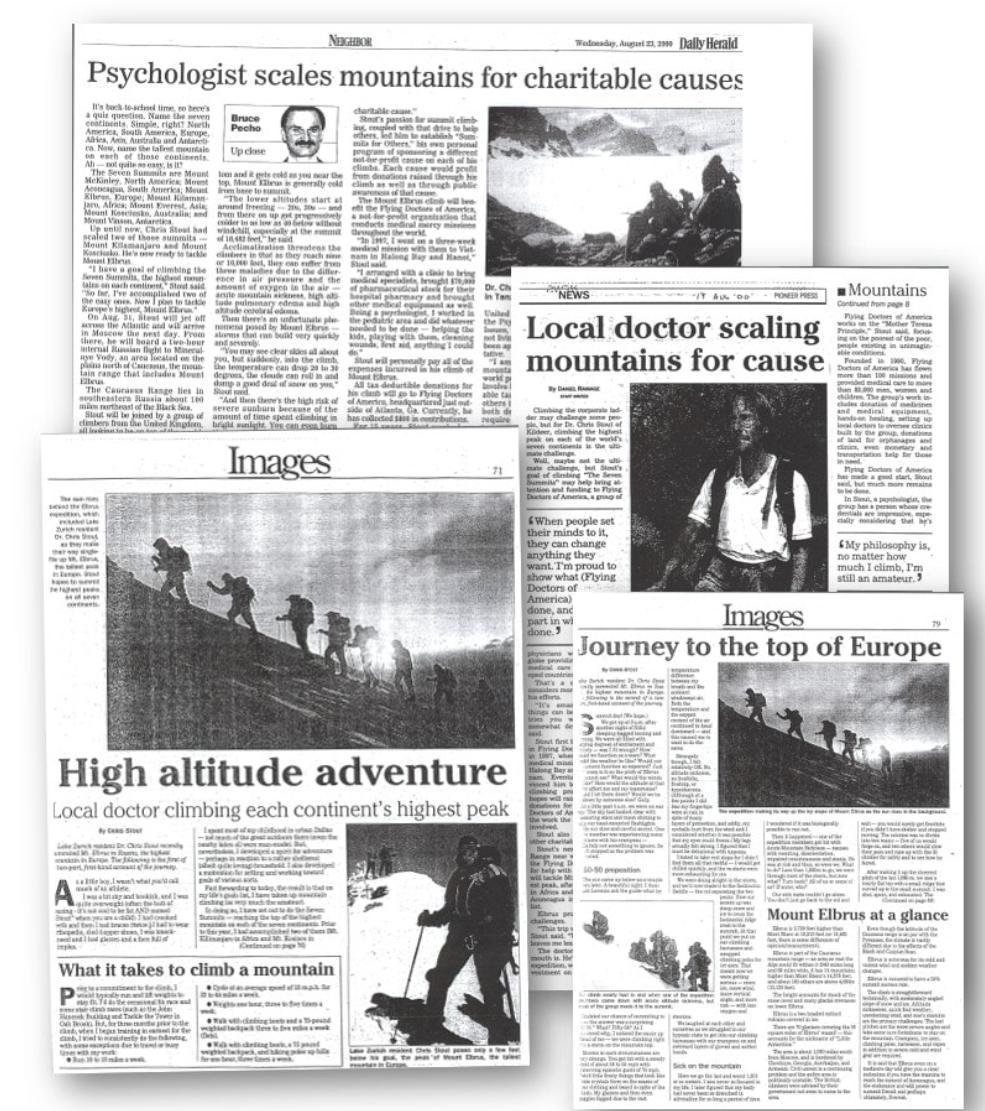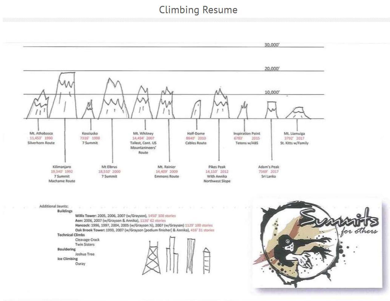 I have summited 3 of the Worldās Seven Summits (thus far), along with Mt. Whitney (the highest peak in the continental United States), Yosemiteās Half Dome, Mt. Rainer, and with my daughter both Inspiration Point in the Grand Teton National Park and Coloradoās Pikes Peak, Mt. Athabasca (Canada), Adamās Peak (Sri Lanka), numerous other non-expedition walls, and a ton of stair climbs in Chicago. I served as a certified climbing instructor for my local YMCA and built a wall in our basement when our children were little.