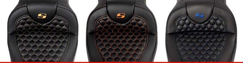 Available in vinyl with Double Diamond Stitch in black, silver or red, Smooth vinyl or Smooth Solar Reflective leather. See the complete selection at seats.dragspecialties.com. Additional coverings, thread colors and stitch patterns are available through our custom order program.