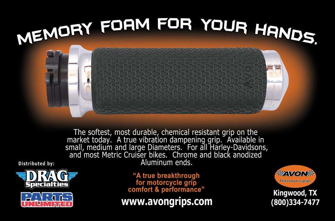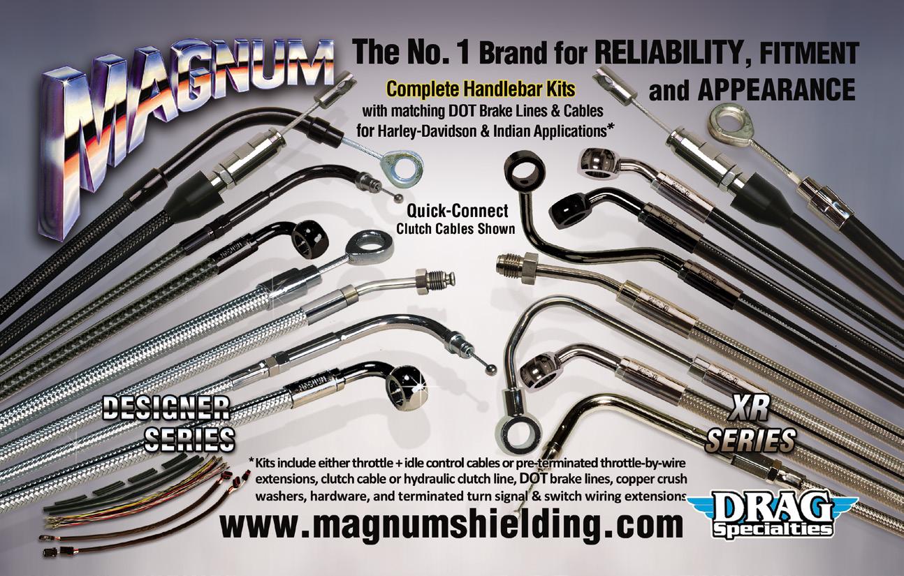 40 Saddlemen » 44 THRASHIN’ Supply Co. » 46 LA Choppers » 48 Todd’s Cycle » 50 Vance & Hines » 52 Biltwell » 54 Ciro » 56 Custom Dynamics » 58 Kodlin USA » 60 Metzeler » 62 Bassani Xhaust » 64 Fat Baggers Inc. » 66 Burly Brand » 68 S&S Cycle » 70 Joker Machine » 71 Trask Performance » 72 Drag Specialties » 73 BDL » 74 RickRak » 75 Feuling » 76 LePera » 77 Nelson-Rigg » 78 EBC » 79 Avon Grips » 80 Cycle Care » 81 Reda » 82 Forceflex » 83 Magnum Shielding