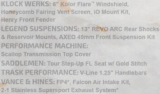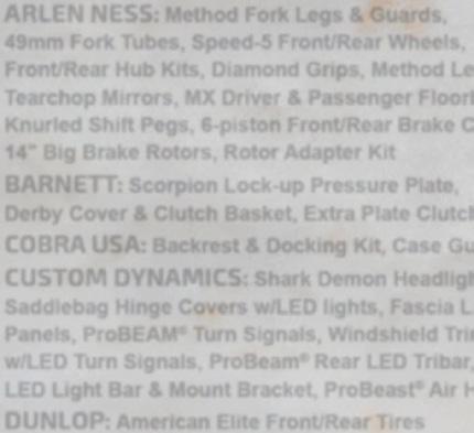 ARLEN NESS: Method Fork Legs & Guards, 49mm Fork Tubes, Speed-5 Front/Rear Wheels, Front/Rear Hub Kits, Diamond Grips, Method Lever Set, Tearchop Mirrors, MX Driver & Passenger Floorboards, Knurled Shift Pegs, 6-piston Front/Rear Brake Calipers, 14" Big Brake Rotors, Rotor Adapter Kit