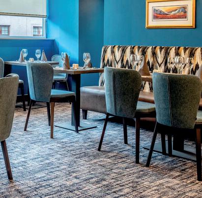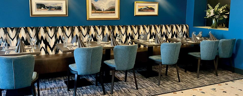 The walls here are a striking blue and the fixed seting is upholstered in bold mustard, black, cream, and grey, all expertly crafted by Grahams Upholstery. The walls feature a raft of Scottish artwork.