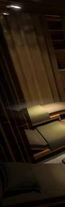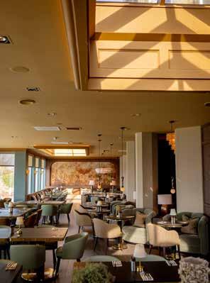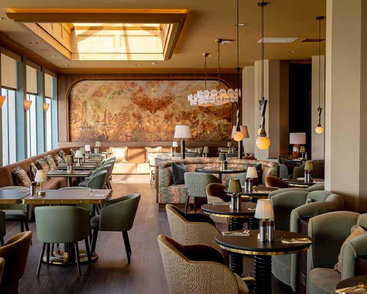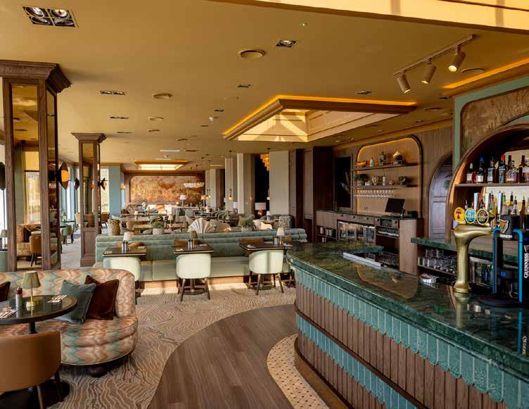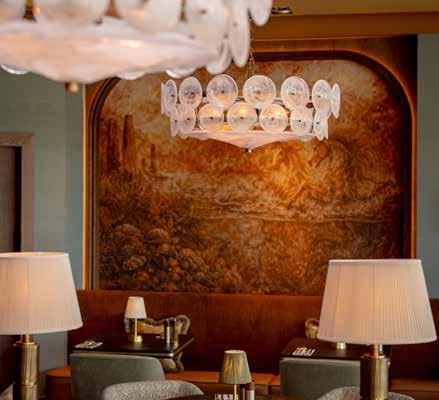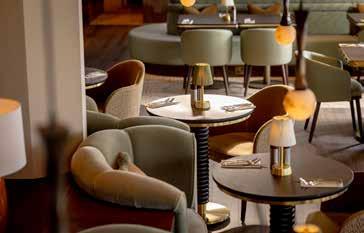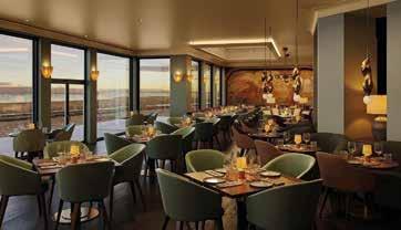 living canvas. The interior language mirrors the view beyond it: curved banquettes echo the sweep of a shoreline, soft contours suggest the pull of a current, and layered textures shift with the quality of the light outside. A coastal-informed palette draws on the ever-changing tones of the Firth - the grey-greens of a stormy morning, the warm amber of a west-coast sunset.