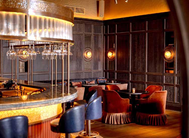 That archway functions as more than a passageway — it is a scene change. The architecture shifts register immediately: materials grow richer, the palette deepens, and the spatial proportions become more enveloping. Lighting, carefully layered and precisely controlled, does the heaviest design work here, modulating the atmosphere from afternoon ease to late-night theatre. A central statement bar anchors the room,