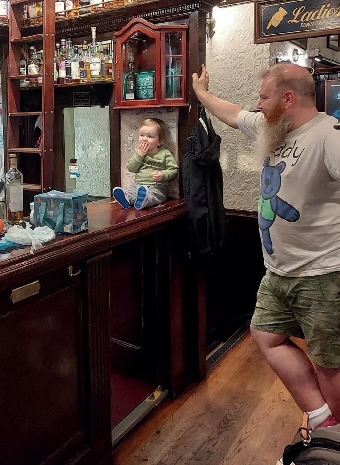 This goes to a picture Frank Murphy of the Pot Still took of his adorable son, Cole, just about propping up the bar. Like father like son- – propping up the bar, and fitting right in!