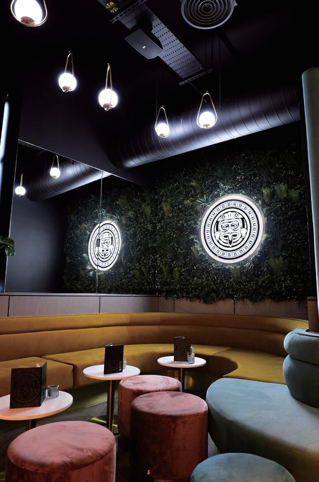 - which is bright and vibrant - tiles of blue, orange, yellow, red and violet run riot behind the bespoke booths, which also feature brass circles above - signifying the gold of the Aztecs. The jade and gold cladding on the bar is also striking and further emphasises the quality finish of the interior which is also enhanced by a plethora of foliage - the majority of which is the real deal.