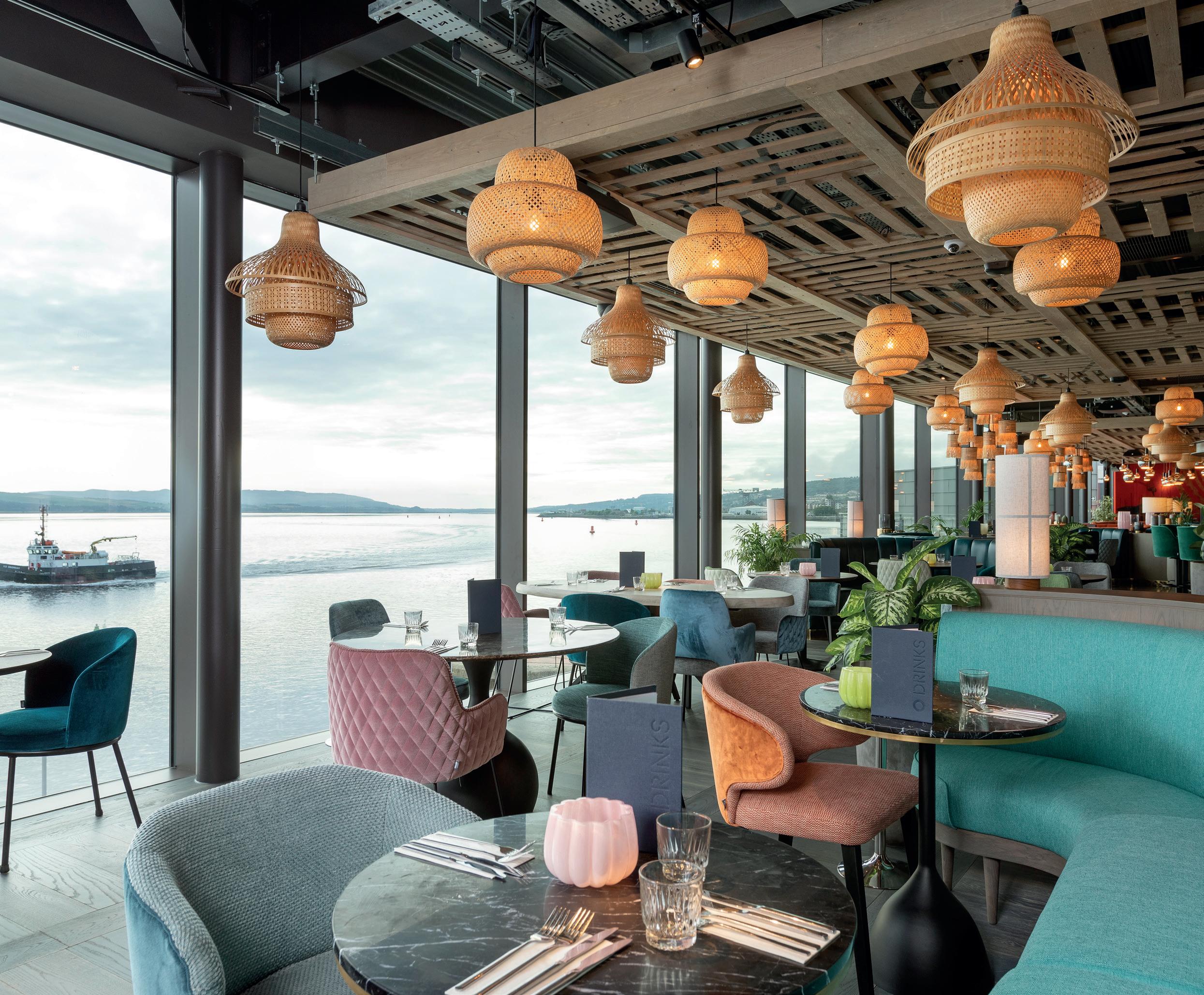 At one end of the venue the wall has been reimagined as a beautiful abstract piece of artwork, by Coll Hamilton acting as a backdrop to the private dining area, it has nods to the ship building heritage of the area. Whereas at the other end, through a huge glass door, is a substantial terrace graced with rattan chairs and comfortable garden sofas. However it is the view that really sets this area off. The interiors are as stunning as the vista and the extensive menu features a blend of traditional and modern dishes to suit all tastes. Even if you are just popping in to enjoy a coffee or a casual drink, Scotts is the type of place where you will want to come back again and again.