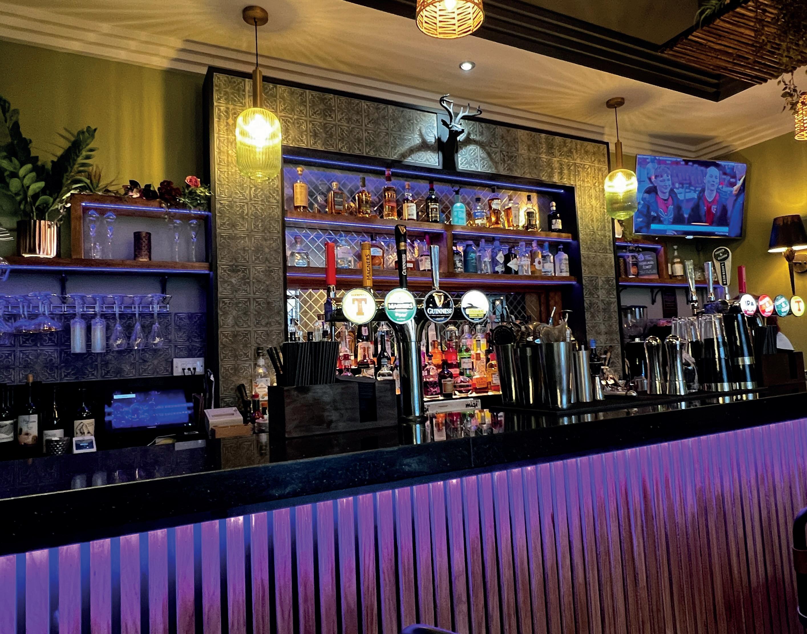 The bar itself has been beautifully finished. The back bar is framed with green rustic style tiles and bespoke shelving with a diamond mirrored backing create a visually appealing backdrop for the spirit bottles.