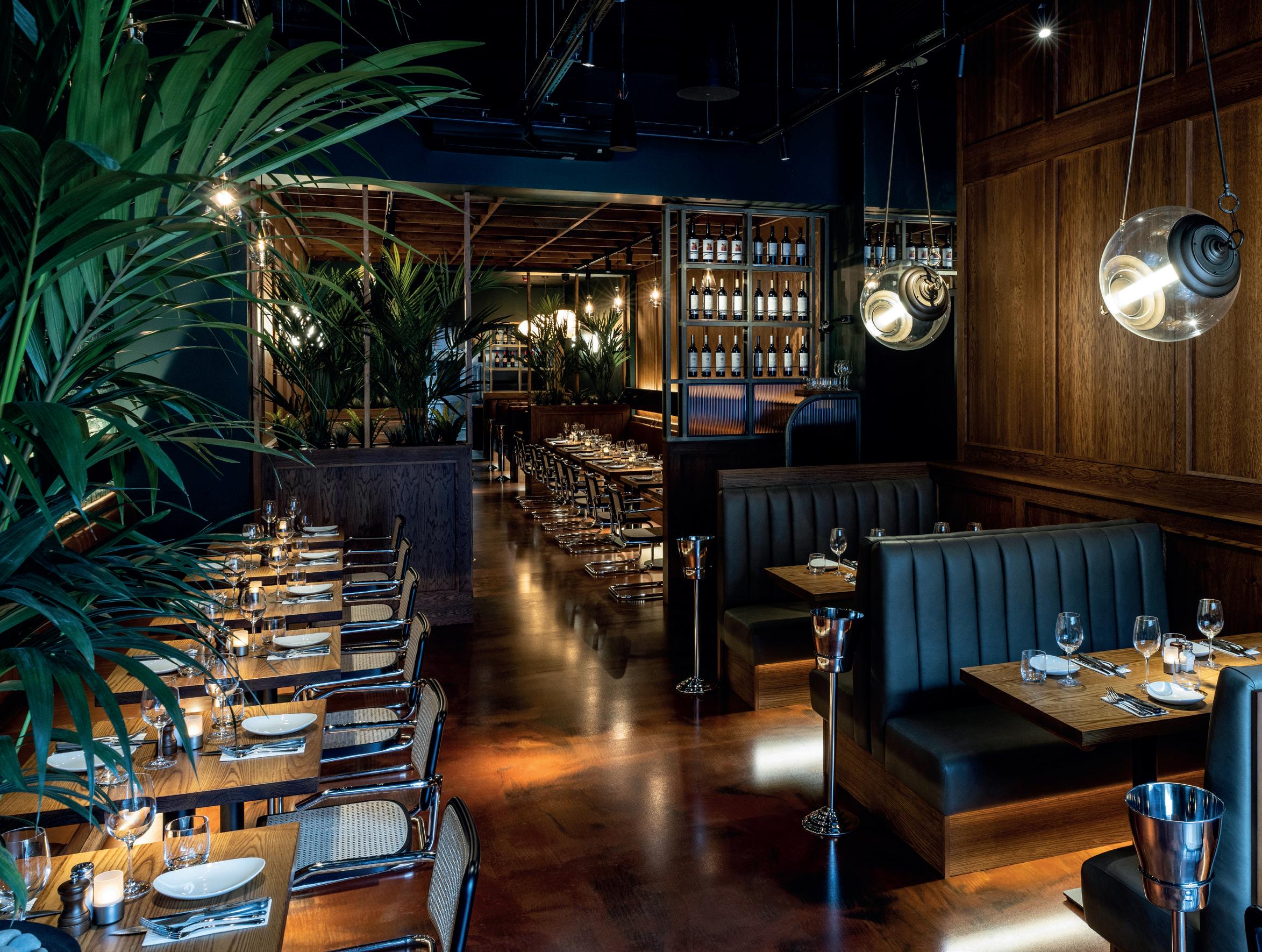 The main restaurant has three different sections that flow seamlessly into one another. The first is located beside the floor to ceiling windows where they have introduced inside screens to recreate the art deco style steel glazed panes from its sister venue – this gives it a real loft feel. The wood panelling scales the entire wall to meet the ornate cornicing