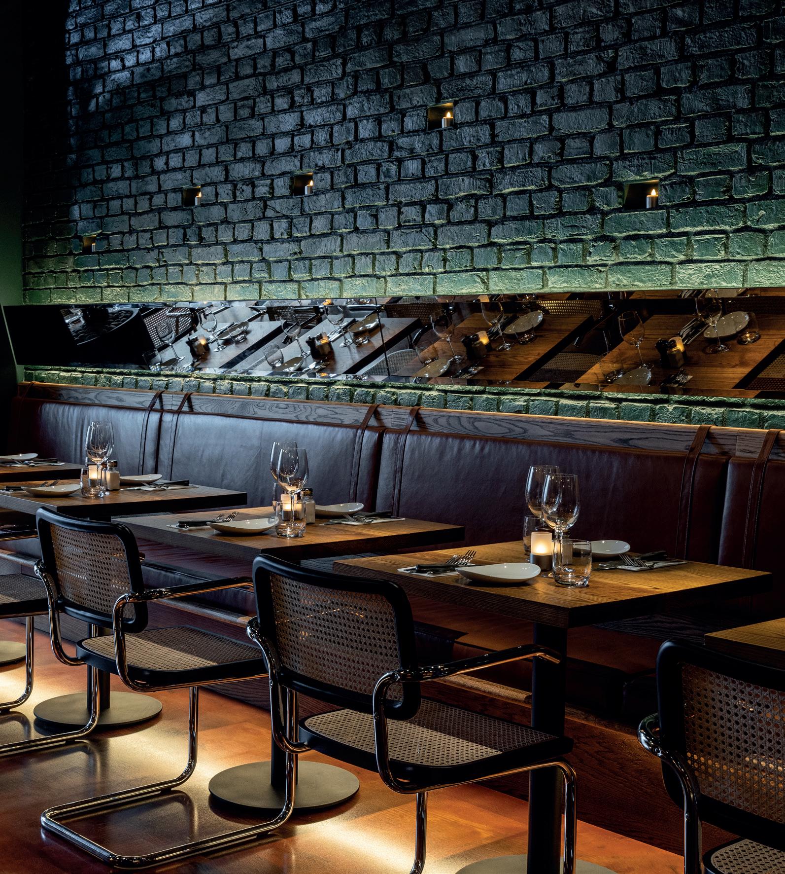 There are so many layers in the design - from a white bare brick wall with planting cascading from the top to the stunning mirrored ceiling which reflects the light from the large windows. The other walls have a dark blue dado, trimmed with the same horizontal tiling used in the bar area, and which gives way to a more muted white Venetian plaster. These are decorated with various framed photos and artwork which have been lit with picture lights. The back wall is painted with