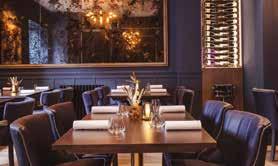 The furniture takes the form of elegant dark wooden tables surrounded by comfortable chairs and some banquette seating which all tones in with the trademark blue colour scheme. These are upholstered in high end velvet fabrics and bring a real richness to the space. Statement lighting is also introduced through smoked glass pendants and modern chandelier style lights with brass frames which illuminate the space with a warm white glow.