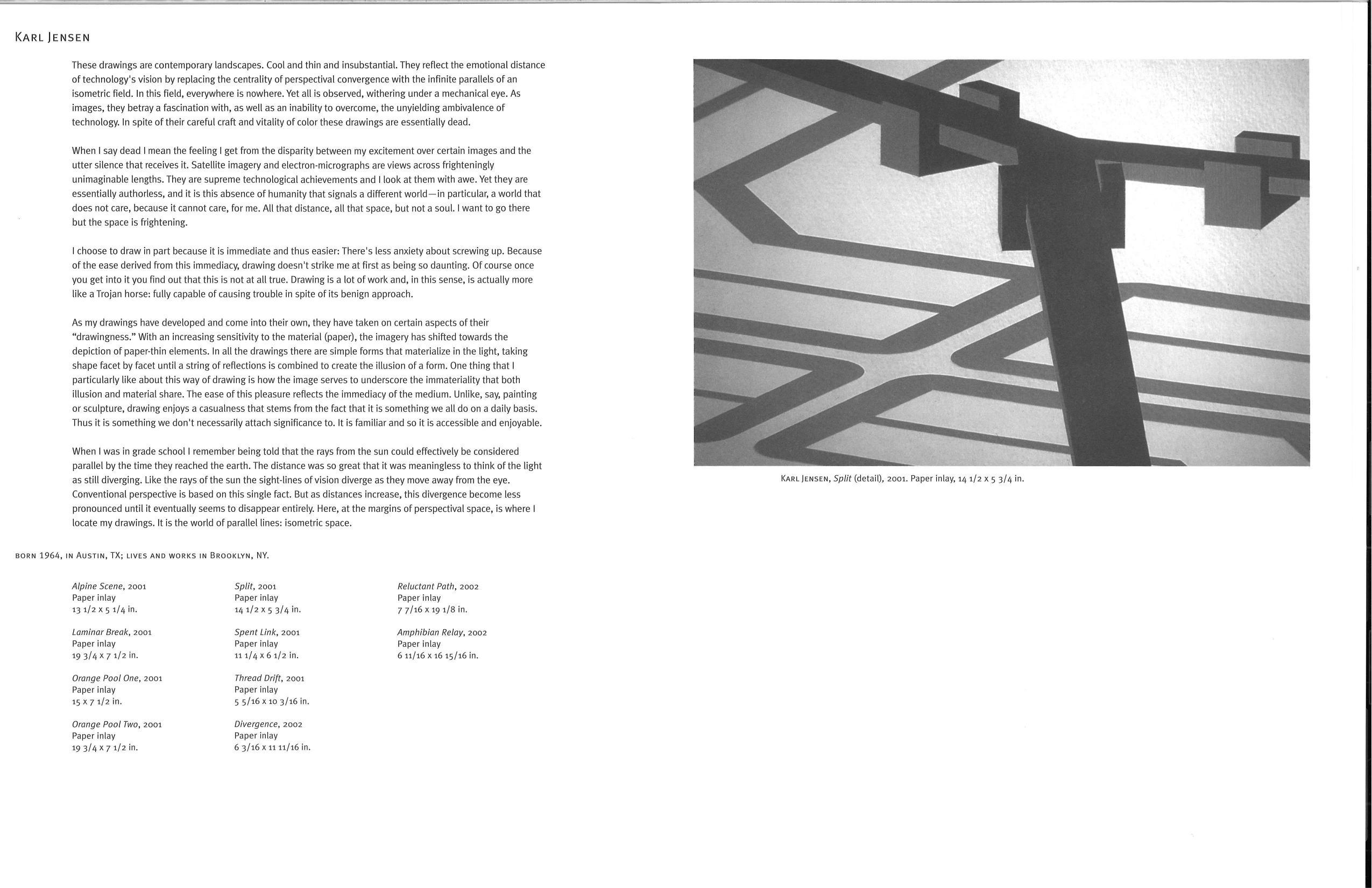 Abstract Tendencies: Selections Fall 2002 was characterized by arrangements of shapes and colors suggesting a tendency toward formal abstraction shared by each artist. The selected artists either re-examined concepts and philosophies of abstraction or presented unabashed representations of the real and everyday. The accompanying publication features works and artist statements by the nine emerging artists selected through The Drawing Center’s Viewing Program: Joachim Bandau, Peter Dudek, William Duty, Nils Gjerdevic, Karl Jensen, Kathleen McShane, Ann Pibal, Suzanne Song, and Caroline Van Damme.