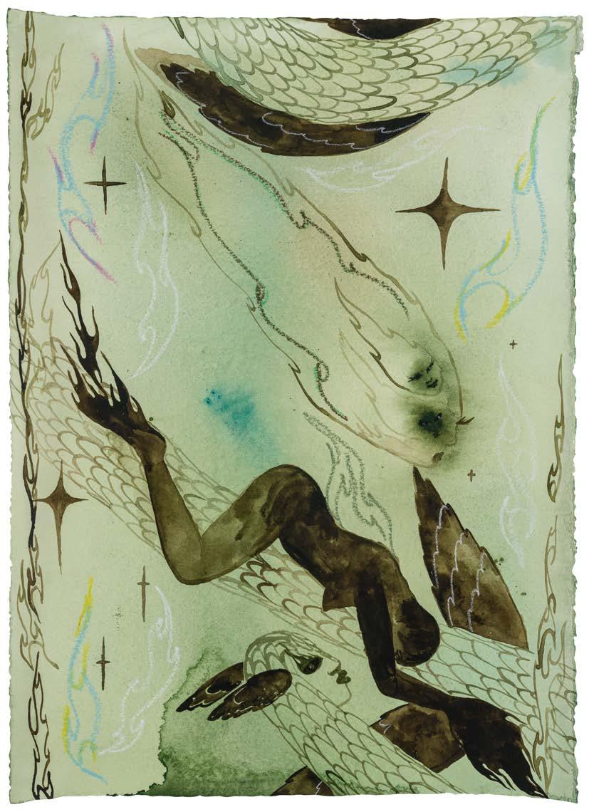 In brilliantly-hued paintings and layered wash drawings as well as, more recently, elegantly-carved sculptural pieces like wrought iron gates and thrones, Naudline Pierre (b. 1989, Leominster, MA) creates fictional worlds rooted in her own mythology. Emphatically and intentionally narrative-driven, Pierre’s work employs a recurring cast of characters that includes winged creatures and fiery beings who exist in a perpetual state of transition. To create her fantastical scenes, Pierre mobilizes time-honored motifs such as the medieval altarpiece and sacred architecture, drawing on an artistic tradition that rejects earthly finitude while foregoing that tradition’s otherworldly solution. The results are visual narratives in which form and figure strive for self-actualization and where movement and fluidity are punctuated by moments of rest, care, and hesitation. Schooled in religious iconography and culture, Pierre rejects spiritual dogma while absorbing its references as well as its skepticism about perceived material and social reality.1 Like color and texture and composition, Pierre has described religious iconography as a tool, that is, a way of taking a leap of faith and making something out of nothing.2 Unlike many of the artistic traditions that have succeeded it, the Western medieval tradition is predicated on an acknowledgment of what image-making fundamentally is: the re-presentation of something that inevitably eludes our capacity to render it. Put differently, it acknowledges an image as something that, in achieving form, is inherently limited, determined by the way that it appears in this space, with these