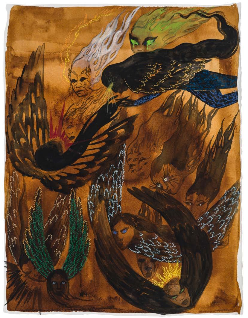 At The Drawing Center, Pierre gives this aspect of the medium free rein, incorporating drawings large and small alongside and within sculptural elements to create an immersive environment in which the viewer is invited on a journey. This dynamic is equally evident in the drawings themselves as image, line, and color unspool together. Like her paintings, Pierre’s drawings remain resolutely figurative, but they approach figuration in a different way. Whereas her paintings typically begin with a figural grouping that Pierre sites within an abstracted landscape, in her drawings, images emerge out of their grounds as though both inherently connected to and separate from the space in which they appear. Witness a group of angelic figures descending from the sky into a sea of orange flames in the aptly titled Come What May [PL. 2]. These bodiless beings appear like the heraldic angels in medieval paintings and, also like them, are manifestly stand-ins, chosen arbitrarily from among their watery counterparts to achieve temporary definition. Indeed, were it not for dabs of bright gouache indicating eyes and feathers, their inky brown faces would be indistinguishable from the radiating brown stains that populate the lower half of the image. Pierre often begins her compositions on paper by laying down an ink ground, which she then works into by alternately dropping more ink and spraying water, allowing the ink to spread. Witness to their irregular edges as they simultaneously cover and reveal the white paper beneath, we process these semi-random marks as shapes taking form and as potential hosts for images.