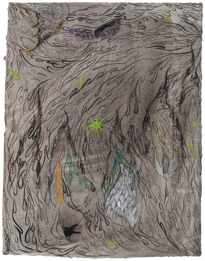 harnesses the sublime power of the unknown, creating fictional worlds rooted in her own mythology. Mobilizing time-honored motifs such as the altarpiece and sacred architecture, Pierre creates fantastical scenes replete with winged creatures and fiery beings that reject earthly finitude without positing otherworldly solutions.