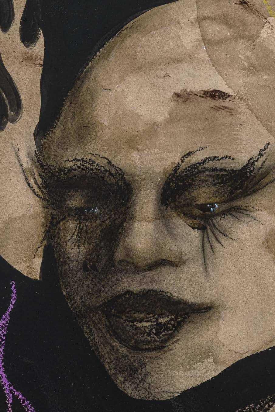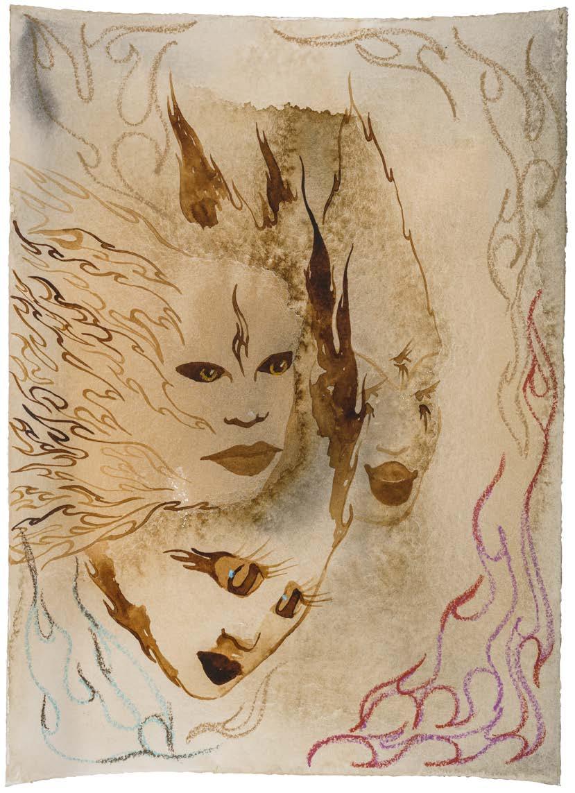 The process whereby an image takes hold is equally evident in Hide Me Under Your Wing, a nearly monochrome, gray-hued wash drawing in which rivulets of ink travel across the paper to settle into recognizable shapes like eyes, faces, and Pierre’s signature wings [PL. 12]. The orange pastel is fire, but it is also just orange pastel; the feathers incontrovertibly feathers yet also discernible as white acrylic paint; the black half mask shielding the visage at the lower left recognizable as a spreading ink stain. The hair of the small figure