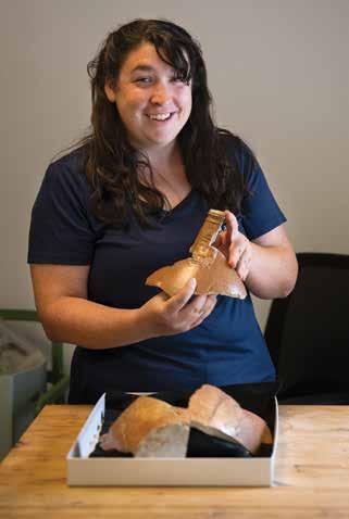 Opposite: A closer look at the excavation, which lies near the 18th-century main house. This page, clockwise from top left: Items in the Conservation Lab’s drying trays include ceramic sherds; Luke Pecoraro holds a new finding, a clay tobacco-pipe bowl; Pieces of rare Black Delftware were discovered in a previous dig.