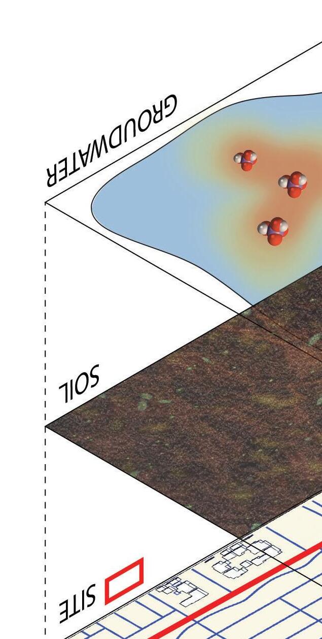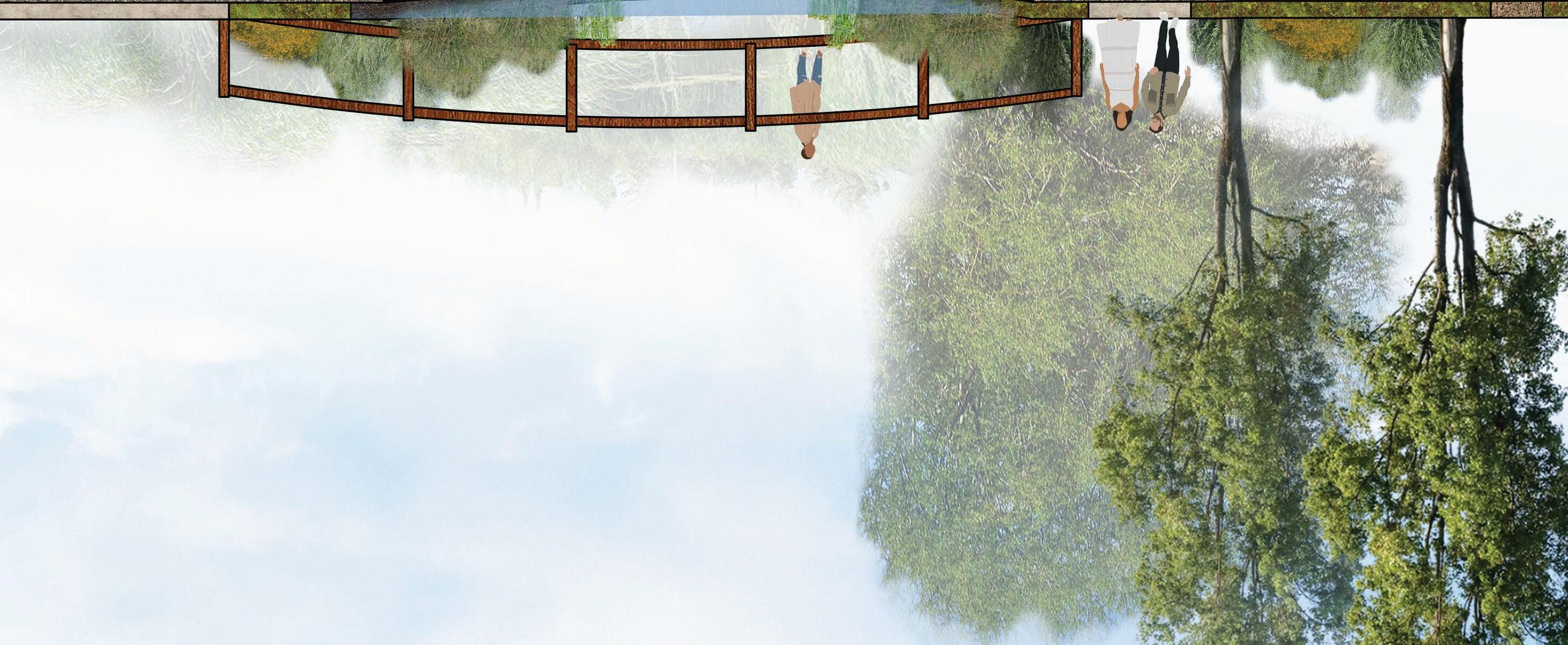 top right bottom Illustrated axon of the percolation basin in wetland design.