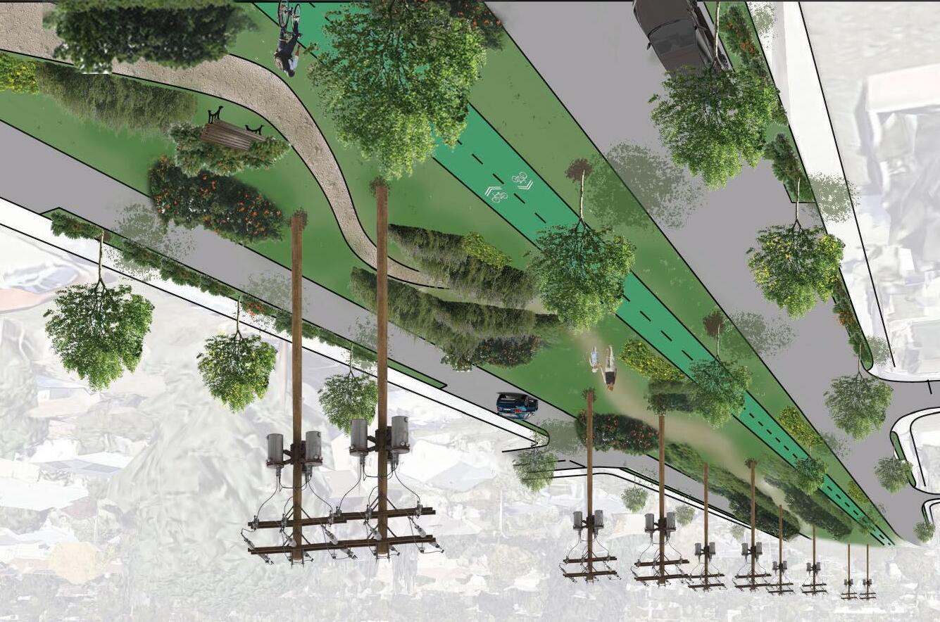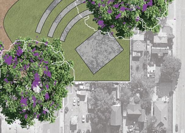 The design transforms the vacant lot at Mission Boulevard and White Avenue into a flexible civic hub anchoring a network of neighborhood parks. Colonnades inspired by the Semillas Community Center support markets, pop-up services, and events, while a sculpted amphitheater creates terraced seating and a performance space. Satellite parks extend civic life into surrounding blocks with flexible structures, public art, and accessible community programming.