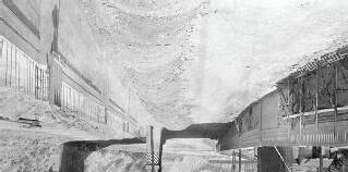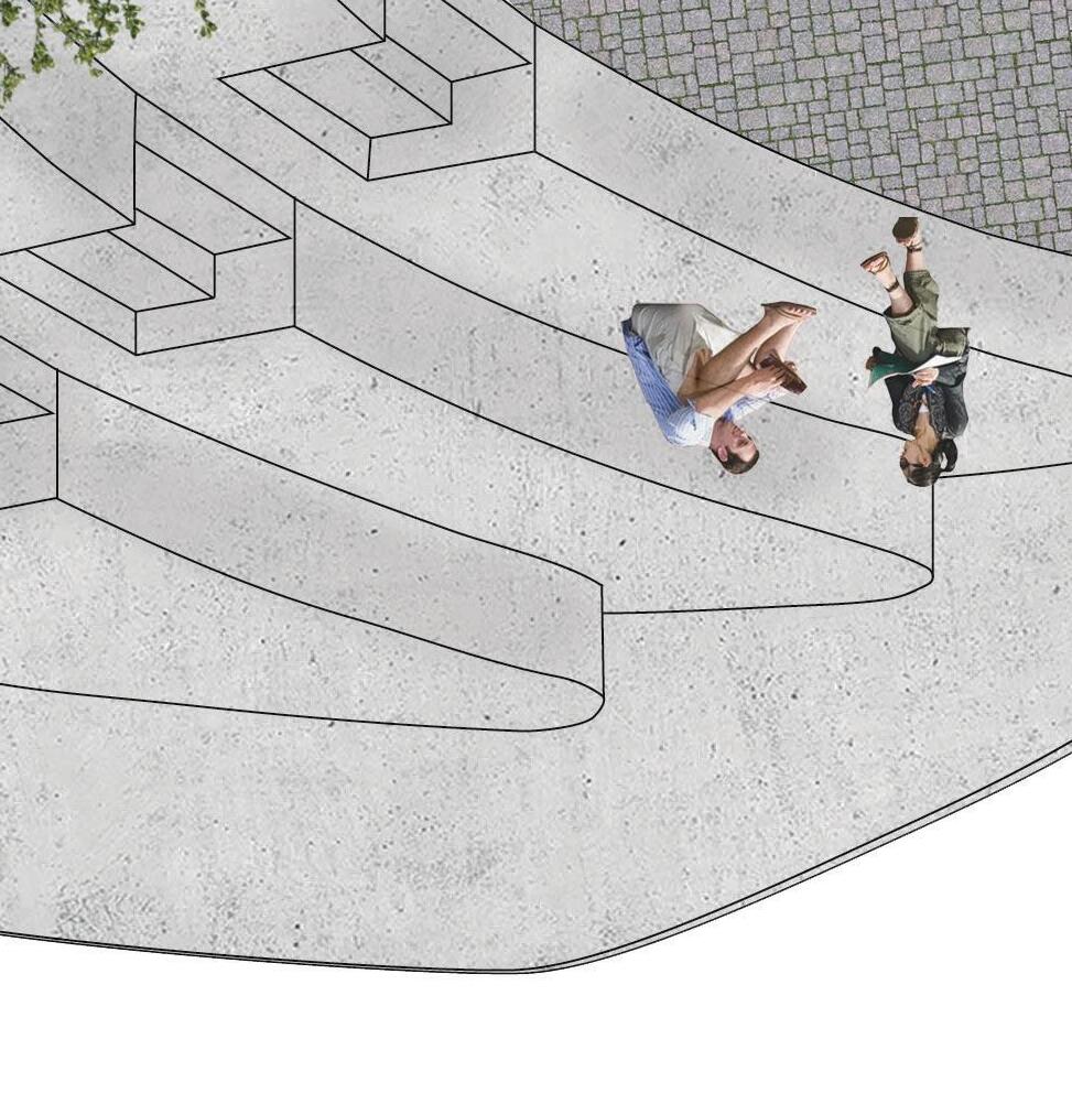 top right bottom An illustrated conceptual section of the colonnaded structure activated during a community market event. Rendered half-sunken amphitheater to show the earthen monund on the opposite side.