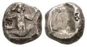Crossed Lines with Lyre type. Branched abstract pattern of chisel marks / Horse to left with rider above, lyre below. ABC 10; SCBC 4; LT.8694; DT.90-93; Van Arsdell 33. 7.65gr, 18mm. Very Fine. Extremely rare.