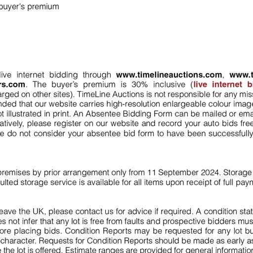 23.Internet Bidding: live, real-time bidding is available to Bidders through the TimeLine website for all live Auctions. Bidders intending to use any other internet bidding service must Register in advance with that service and the provider’s normal charges at up to 6% (VAT inclusive) will be payable in addition to the Buyer’s Premium. It is entirely the responsibility of the Bidder using any bidding service to ensure that Bids are made accurately; Bids cannot be retracted once made and are binding on the Bidder in all circumstances. TimeLine are not responsible for any technical or other failure which results in Bids not being received.