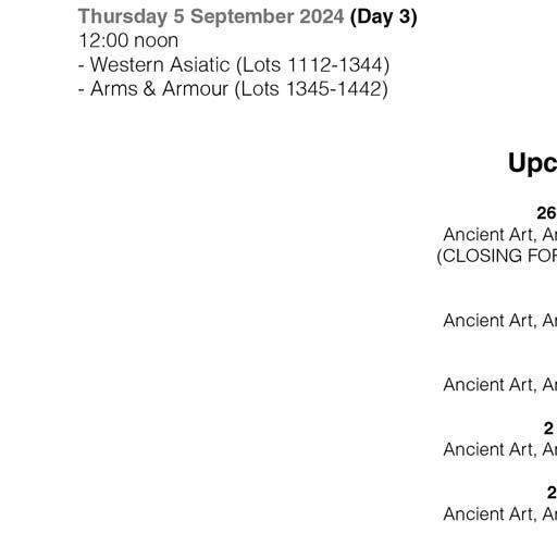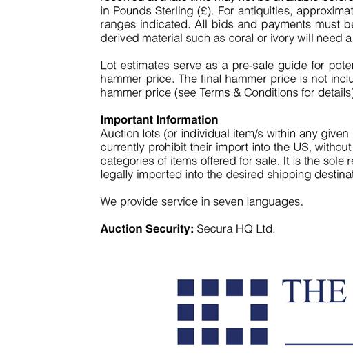 12.Lots: all goods submitted to TimeLine will be lotted, catalogued and offered by live auction sale, limited timed auction sale, 'buy it now' direct sale or other method at the sole discretion of TimeLine; antiquities, antiques and collectables Lots with a low Estimate of £200 or less and coin Lots with a low Estimate of £100 or less will not normally be illustrated in any printed catalogue and printed text entries may be minimised (images and full text will always be shown on the TimeLine website); Estimates are provided for information only and Hammer Prices may differ from the estimated range.