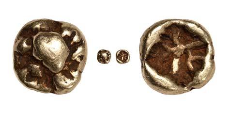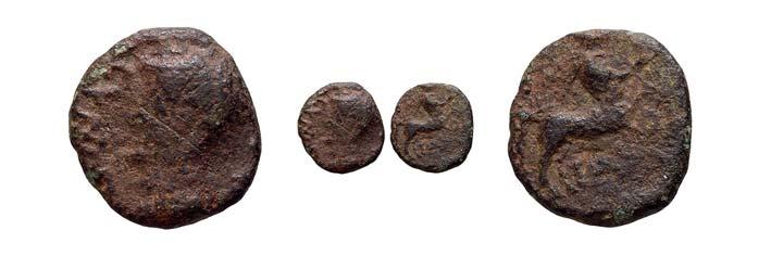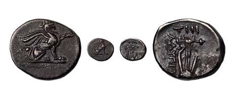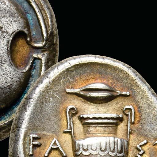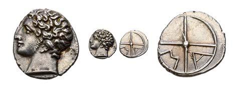 Bare head of Apollo to left / M-A within wheel of four spokes. Maurel 360. 0.71gr, 10mm, 4h. Extremely Fine. Small die break on reverse. Sharply detailed; toned with traces of blue-green iridescence on obverse. £400 - 600