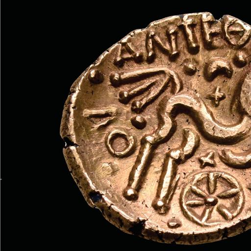 2881 Celtic Britannia. The Dobunni, Antedios AV Stater. AD 20-43. Anted Rig (Dobunnic D) type. Dobunnic emblem of tree with pellet at base / ANTE -[R]I-C-OV, stylised triple-tailed horse to right; cross and crescent between pellets above, cross above six-spoked wheel and pellet below, cross and pellet beneath horse’s head, three pellets beneath tail. Cf. ABC 2066 note (only one other of this type known); Van Arsdell 1069-1 var. (ANTED); BMC 3023-27 var. (same); SCBC 379 var. (same). 5.44gr, 19mm, 10h. Good Extremely Fine. Well-centered with sharp details. Extremely rare variant.