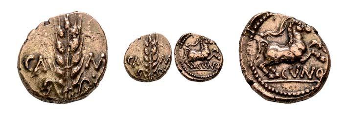 2878 Celtic Britain. Britannia, the Trinovantes & Catuvellauni AV Stater. Cunobelin, circa AD 20-43. Camulodunum mint. Classic type. Grain ear with central stalk and tendrils at base; CA-M[V] and pellet flanking / Horse rearing to right; branch above, CVNO below on exergual line. ABC 2798; Van Arsdell 2027-1; SCBC 288. 5.36gr, 18mm, 12h. Very Fine. Lustrous metal. £1,000 - 1,400