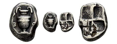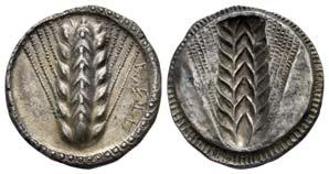 2892 ‡ Lucania, Metapontion AR Stater. Circa 510-470 BC. Ear of barley with seven grains; META retrograde downwards to right; all within cable border / Incuse ear of barley with eight grains. Cf. Noe Class IX, 193; HN Italy 1482. 8.11gr, 24mm, 12h. Near Extremely Fine. £1,000 - 1,400