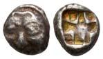 2897 ‡ Macedon, Akanthos AR Diobol. Circa 430-390 BC. Head of Athena to right, wearing crested Attic helmet / Quadripartite incuse square; [A-K-A-N] in quadrants. SNG ANS 50; SNG Ashmolean 2218; HGC 3.1, 393. 0.92gr, 11mm. Near Extremely Fine.