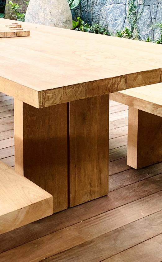Table et bancs en SUAR massif plateau “tree shape” d’un seul tenant (180x100x8x80cm)
