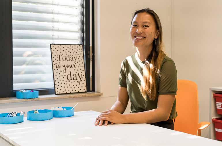 Lily: ‘Cliënten worden altijd uitge daagd om meer te leren. Dat kan eenvoudig rekenen zijn, maar ook helpen met de lunch klaarmaken of leren veters strikken. Ieder op zijn/ haar eigen niveau. En heb je even rust nodig, dan is er de snoezelruim te of de ballenbak. En de wat oudere cliënten maken allerlei mooie pro ducten in de werkplaats, zoals een vogelhuisje en een picknickbank voor eekhoorns.