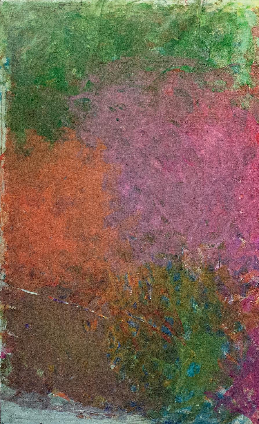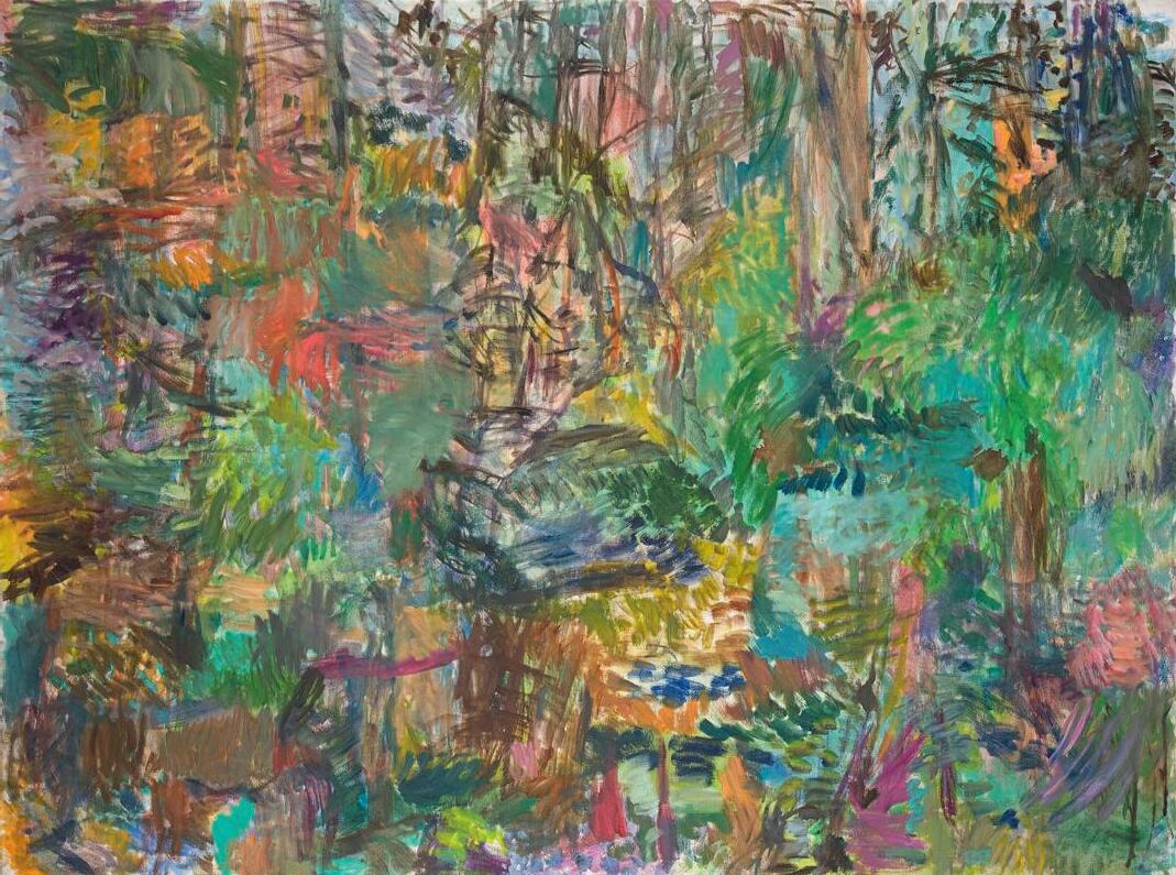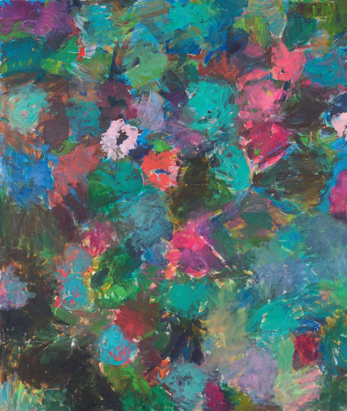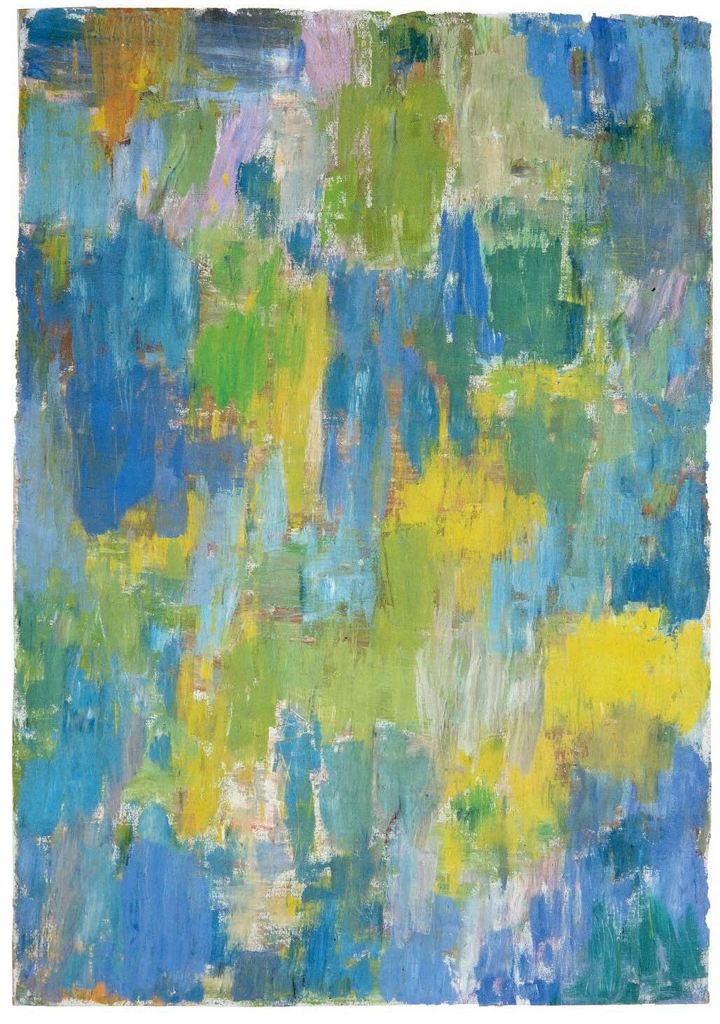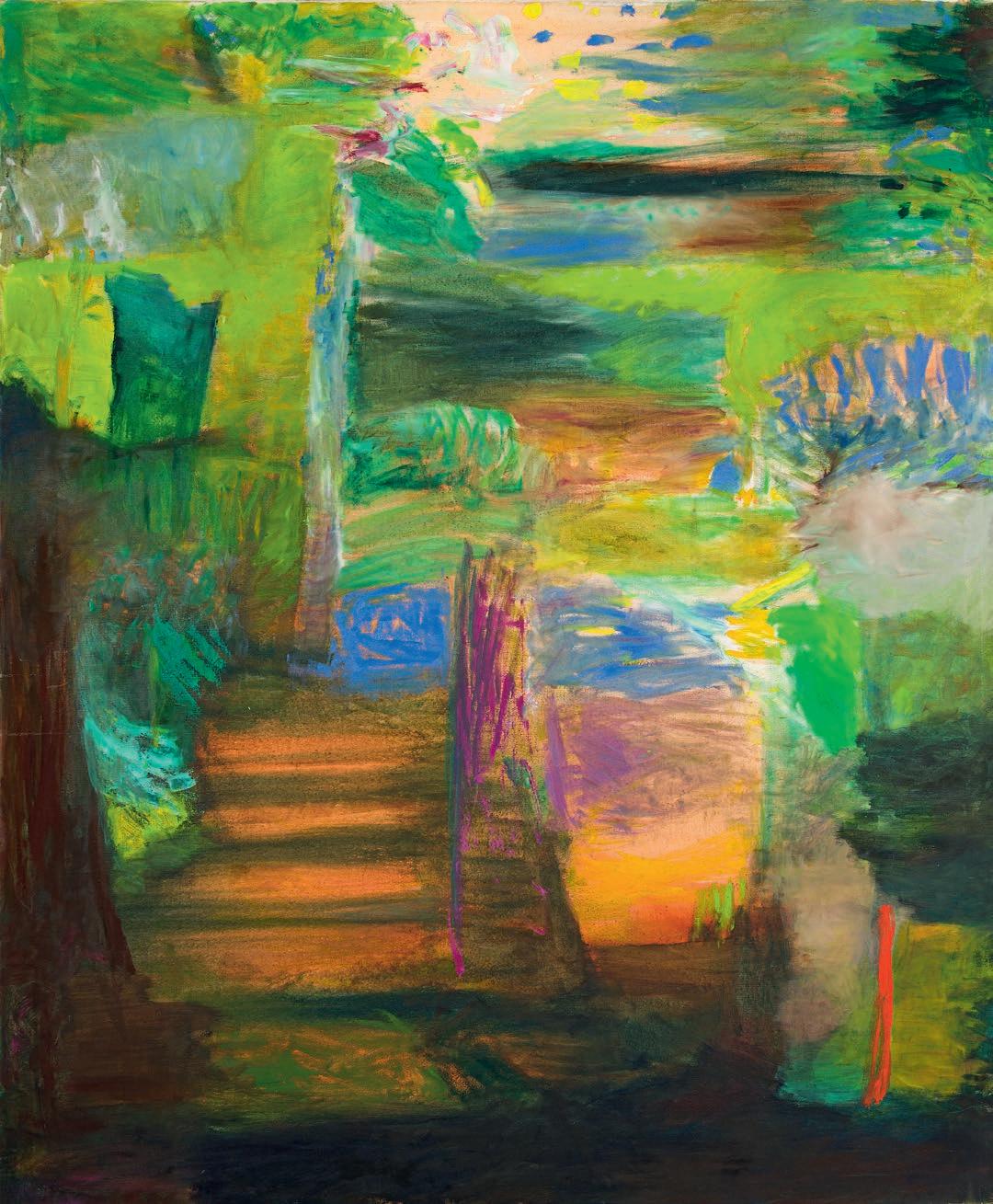 Wandern wir zum „Grün im Grün“, einem deutlich späteren Bild, könnten wir es doch beinahe “ge genständlich“ in dieser gegenstandsfreien Haltung verstehen. Hier wirken ähnliche Kräfte, aber sie differenzieren sich gegenseitig zu schwimmendem, stehendem, Licht tragenden und Licht schluckenden Grün. Hell-Dunkel-Zonen, verschiedene „Wachstums“-Zonen, Tiefe des Raums, die über sich selbst hinaus verweist. Ein Nach-draußen-schauen und Verorten des Betrachters davor, der Nahblick und Ferne wie aus einer Hockhaltung verbindet. Ein gebanntes Schauen. Ein sich wechselseitig in Beziehung-setzen zur Bildfläche, stimmig und klar die Farben: gesteigerte Reali tät. Gegenständlich und gleichzeitig nicht-gegenständlich.