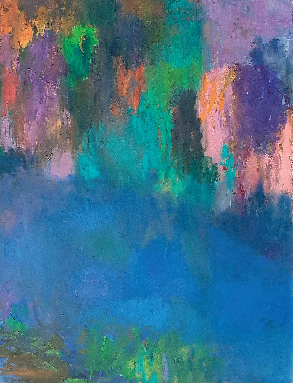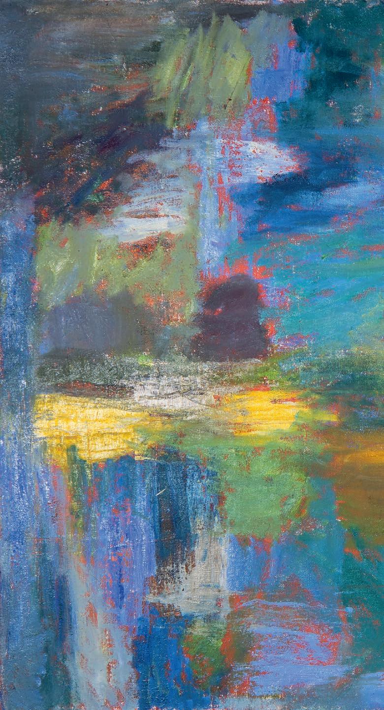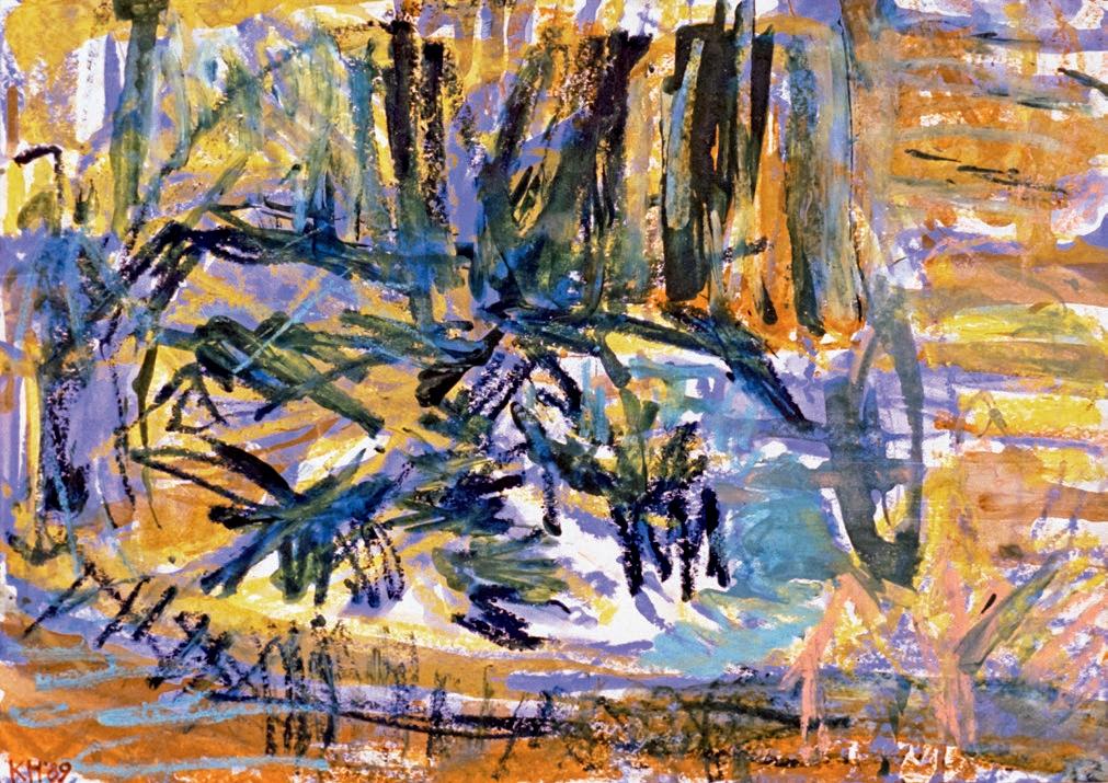In dem kleinen Bild „Weiher“ ist die Realitätssicherung stärker. Natur ist hier nicht nur Suggestion, sondern durch Farbform als verdichtender Freisetzung gesteigert: Himmel, Wasser, Vegetation sind durch Licht aufeinander bezogen, nicht in den Spiegelungen, die keineswegs bloße Doppe lungen gemeinter Phänomene sind, sondern verschiedene Dichte des Lichts, dessen Übergänge wie vertraute Begegnungen einander antworten und sich durch dunklere ‘materielle‘ und helle, lichte Zonen gegenseitig steigern. Meisterhaft gesetzte Farbformen, die geheimnisvolle Ruhe und Ausgeglichenheit vermitteln.