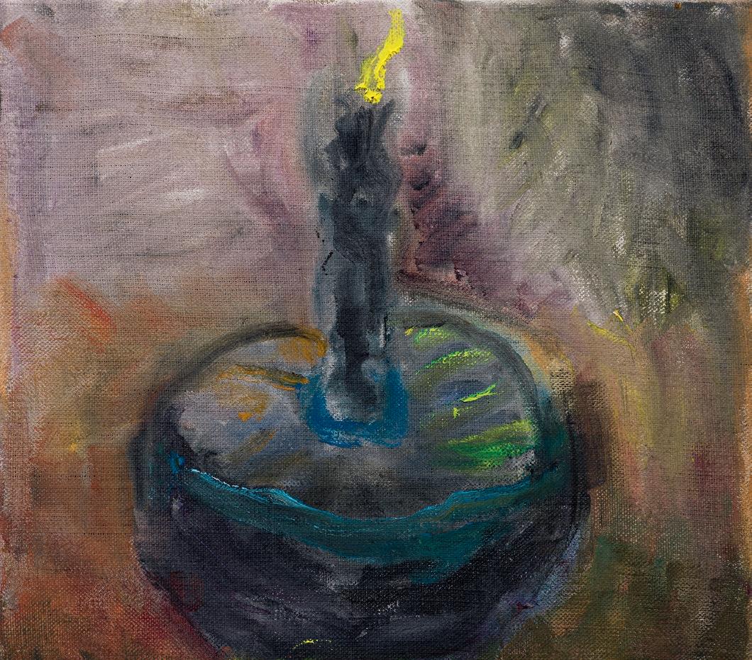 Schlicht, konzentriert wird aus dem Dunkel des Innenraums der Topf in hellem Eigenlicht hervorgehoben als eine Art VanitasStillleben.