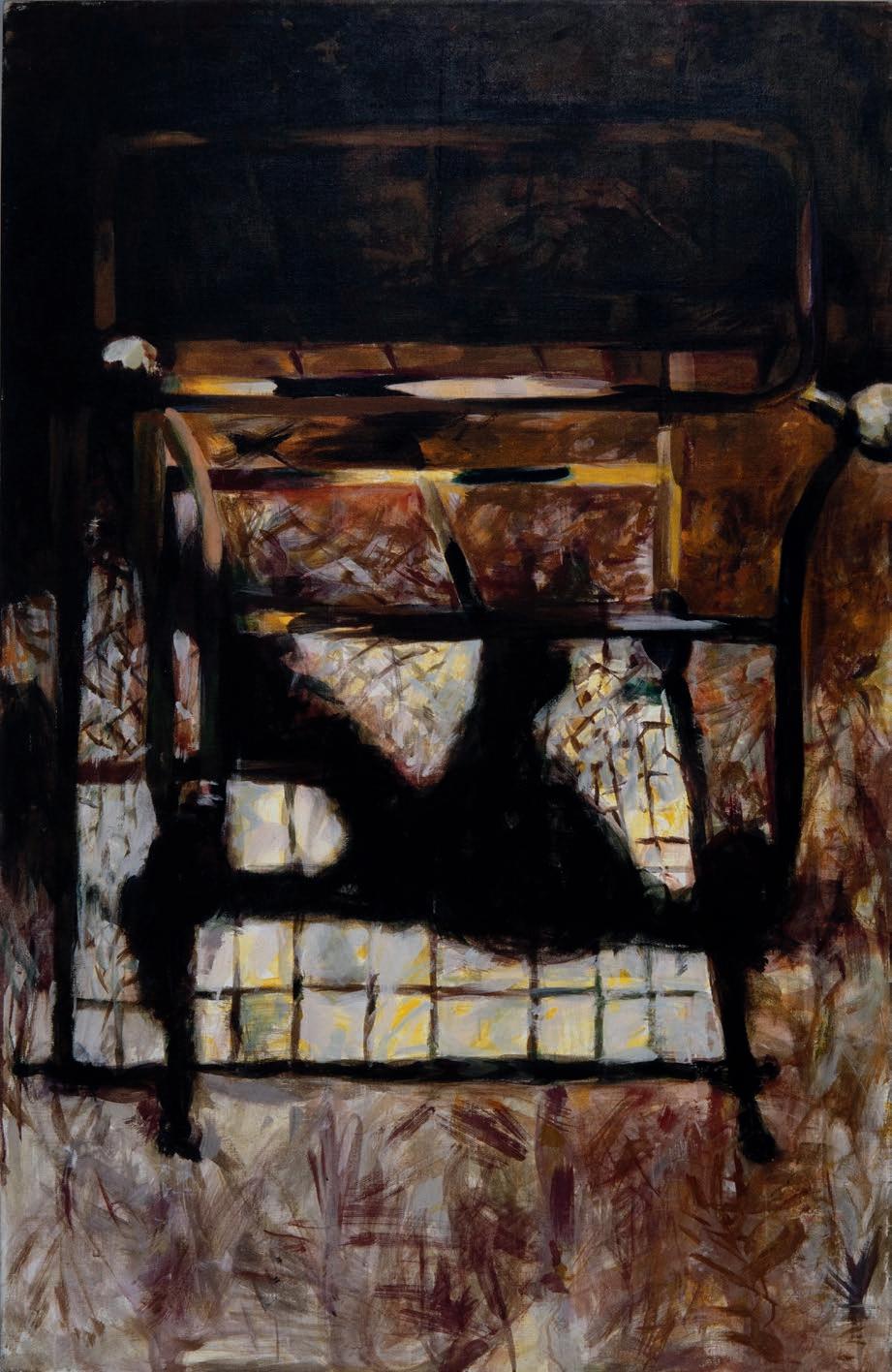 Die Bildmitte eine dunkle Halbbogenform, die den weißen Türknauf als gestalterisches Element einbezieht zur Präsenz des Bildkörpers und Mitte für den Tiefenraum, in den der Blick wandert. Eine „Tür“ zum Schauen. Verblüffend ist die sichere, leichte, begabte Verwandlung der Fläche, die das Bild so selbstverständlich zur Erscheinung bringt. Lebendig und einzigartig.