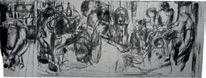 Dort betritt man eine alltägliche Kneipen- und Thekensituation wie einen begehbaren, engen Höllenort von verhaltener Aggressivität und gleichzeitiger Morbidität. Eine Szene verkapselter, öder Geselligkeit, Melancholie und Zeitstillstand. Die Figuren werden in ihrem gefühlten Kör perinnenraum deutlich, in ihrer vielfachen Überlagerung, ihrem Anstoßen und Angleichen an einander und in ihrer Bezugnahme auf eine gemeinsame, vage verbindende Umgebung einer angedeuteten Tischsituation. Heillose Figuren bei Kienholz, so auch hier, aber eher in einem von Max Beckmann beeinflußten Duktus für ein abgründiges menschliches Ineinander und durch Einander / Durcheinander. Ohne Farbe. Energielinien, die ihr Miteinander in ihrem unausdrück lichen Bezogensein auf die Bildfläche finden, ihre Ordnung in der gestalterischen Zuordnung.
