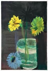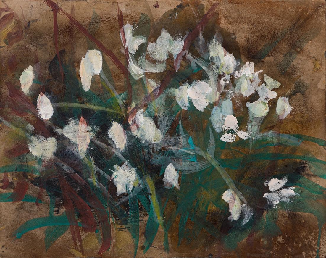 Viele Blumenbilder sind dunkelgrundig; ein Dunkel, das aufgelöst wird, durchstrahlt durch lichte Farbformen, die von Blütenformen inspiriert sind. Blumenformen in einfachen Strukturen, die gegenständliche Reduktion und bildimmanente Erfindung gleichzeitig sind. „Schneeglöckchen“ wirken wie kleine weiße Laternen, deren Form völlig charakteristisch getroffen ist, in einfachsten Pinselstrichen von enormer Leuchtkraft, (siehe Abbildung S. 69).