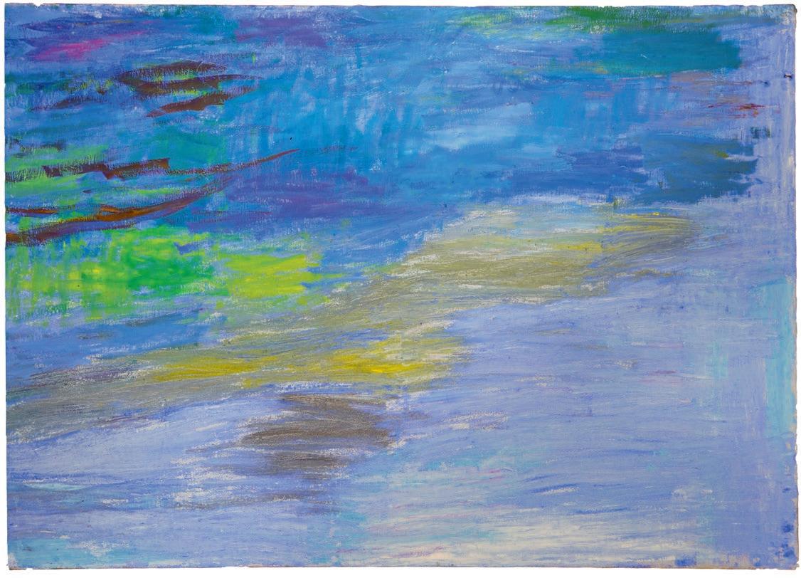 Demgegenüber erscheinen die ungegenständlichen Bilder völlig freigesetzt. Etliche sind ein heitlich als „Wasserkreuze“ betitelt. Was kommt in ihnen zur Anschauung? Strömungsfelder, die die Vertikale und Horizontale ausspannen, Balancezustände abfangen. Die Farbwirkung mutet durch die Gründominanz vegetabil an, erinnert durch die verschiedene Dichte und Lichtwirkung an Spiegelungen. Feinkörperlich die Farbe, als Ausformung von Licht in verschiedener Stärke, Farbkörperwahrnehmung wie bei geschlossenen Augen – und dennoch ein starker Außenbe zug vor jeder gegenständlichen Verfestigung. Gemalt auf handgeschöpftem Papier mit dem ihm eigenen Unregelmäßigkeiten wirken die Bildränder wie provisorische Grenzen, leicht schadhaft in ihrer Materialität, ein wenig wellig geschnitten. Und Blau bleibt verborgen.